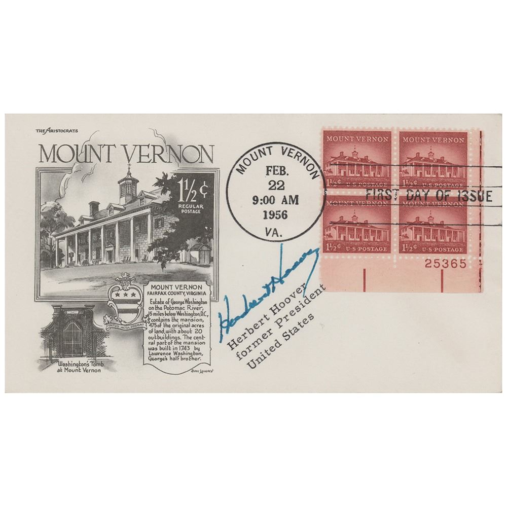 FDC with a cachet honoring George Washington's estate at Mount Vernon, postmarked there on February 22, 1956, signed in dark blue fountain pen by Herbert Hoover above a typed caption. In fine condition.