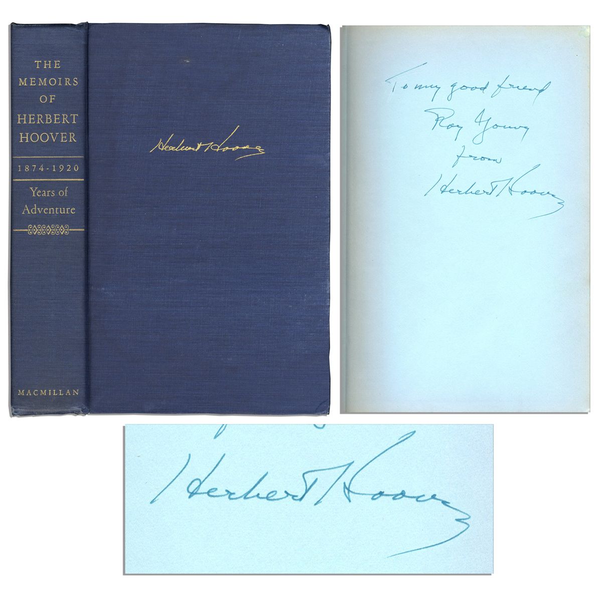 Herbert Hoover signed first printing of ''The Memoirs of Herbert Hoover 1874-1920 / Years of Adventure'' published by The Macmillan Company: New York: 1951. This first of Hoover's three-volume memoirs covers his early life and career before he became 31st President of the United States. Autograph inscription to front free endpaper in blue ink reads in full, ''To my good friend / Roy Young / from Herbert Hoover''. Young served as chairman of the Federal Reserve Board during the start of the Great Depression. Bound in blue cloth boards with gilt lettering. Runs 496pp. Measures 6.25'' x 9.5''. Light wear to boards and faint toning, else near fine.