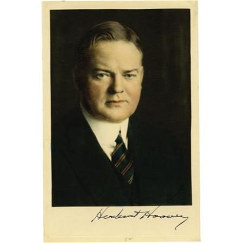 <B>Herbert Hoover Signed Hand-Tinted Photograph.</B></I> A wonderful 5.5" x 8.5" bust photo of our 31st president that has been painstakingly hand-colored. Hoover has signed it boldly in ink in the lower wide margin. Mounted to cardboard, excellent condition. As nice a Hoover signed photo as you're likely to find. <I>From the collection of Henry E. Luhrs.</B></I><BR><BR><b>Shipping:</b> Flat Material, Small (<a target="_blank" href="http://www.heritageauctions.com/common/shipping.php">view shipping information</a>)