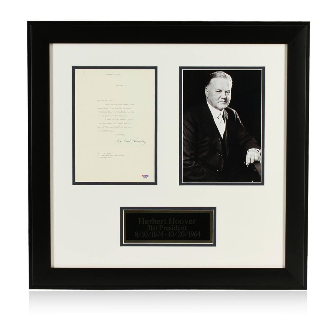 A one of a kind display featuring a letter signed by President Herbert Hoover showcased in a beautiful custom matted display that features a photo of Herbert Hoover. The signature is authenticated by PSA. Herbert Clark Hoover (August 10, 1874 - October 20, 1964) was the 31st President of the United States (1929 - 1933). This piece comes framed and ready to hang! Dimensions: 25" x 24". PSA Certified.