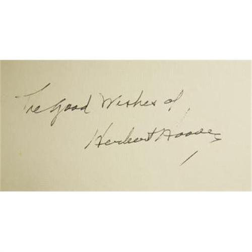 <B>Herbert Hoover: Signed & Numbered Limited First Edition of <I>A Remedy for Disappearing Game Fishes</B></I>.</B></I> (New York: Huntington Press, 1930), first edition, numbered 676 of 990 copies, 41 pages plus limitation page, gorgeous marbled paper boards shelf-backed in green cloth with gilt lettering on the spine, 8vo (6.25" x 9.5"), original slipcase additionally housed in a custom quarter leather slipcase with gilt titles & five raised bands on the spine. Most page gatherings uncut along the top edge. A rose petal from Hoover's grave is laid-in along with a snapshot of Hoover's and his wife Lou Henry's headstones. Boldly inscribed and signed "<I>The good Wishes of Herbert Hoover</B></I>" on the front free endpaper. The book is in very good condition. Upon release, this book was not signed; a collector obtained Hoover's signature at a later date, making this rare book even more desirable as it is surely one of the only signed versions of this particular release.<BR><BR><b>Shipping:</b> Books & Catalogs (<a target="_blank" href="http://www.heritageauctions.com/common/shipping.php">view shipping information</a>)