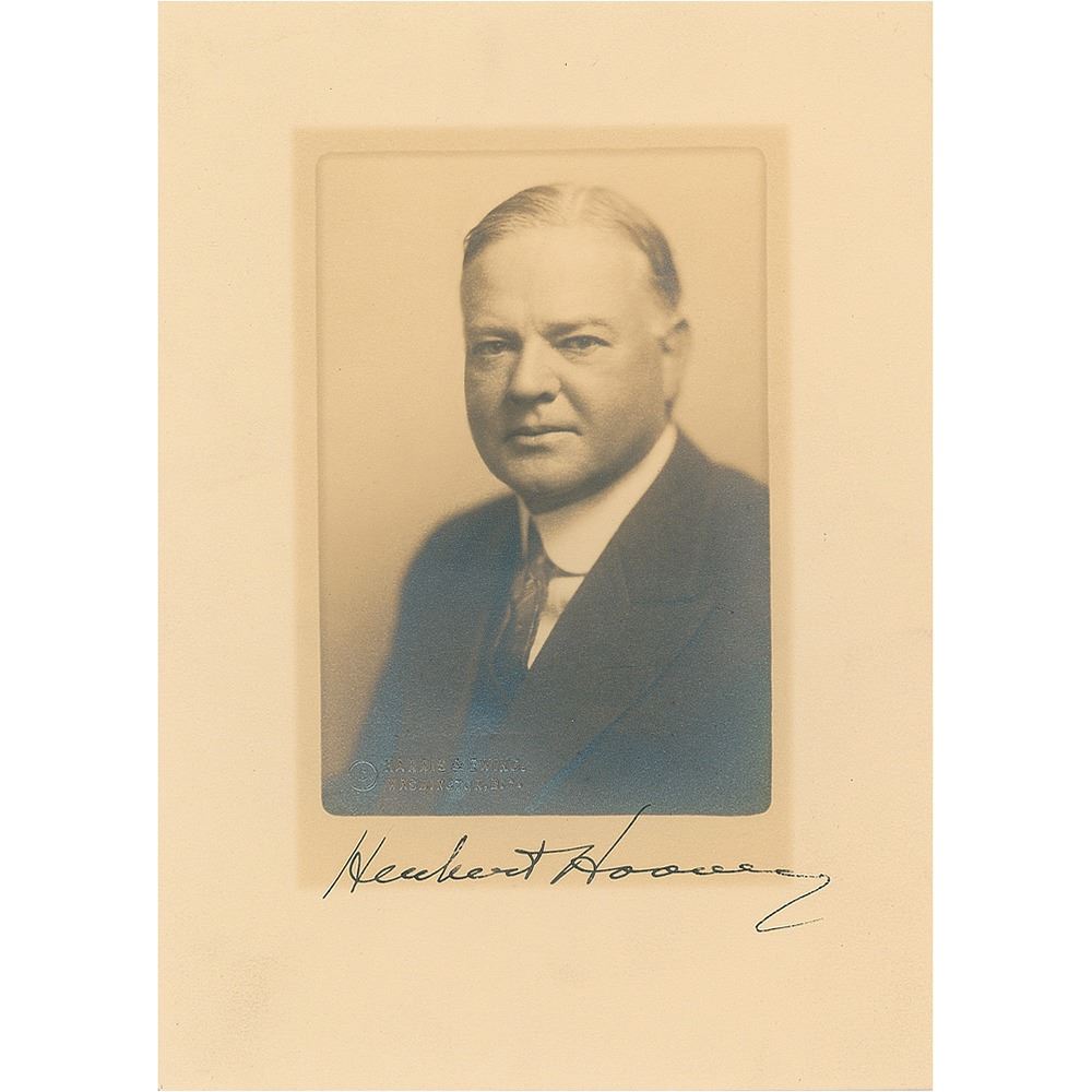 Vintage matte-finish 5 x 7 photo of Hoover by Harris & Ewing, signed in the wide lower border in fountain pen. Blindstamped in the lower left corner by the studio. In fine to very fine condition, with light silvering to the darker areas of the image.