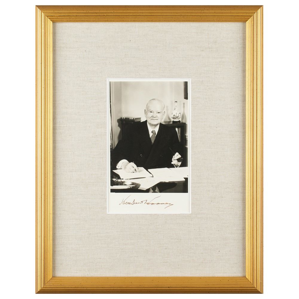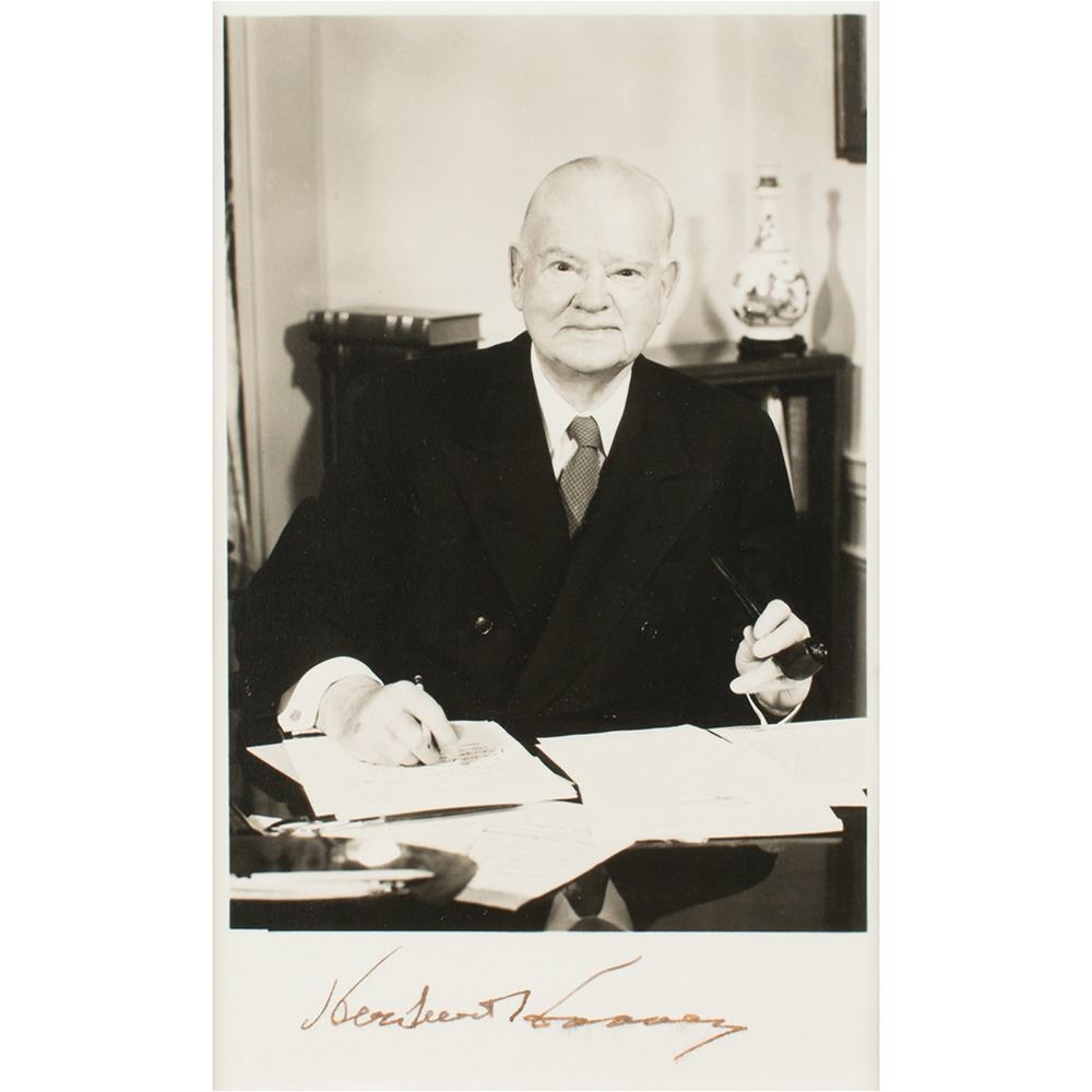 Matte-finish 4.75 x 7.75 photo of the elderly Hoover seated at his desk, signed in the lower border in ink, "Herbert Hoover." Matted and framed to an overall size of 13.25 x 17. In fine condition, with light brushing to the ink.