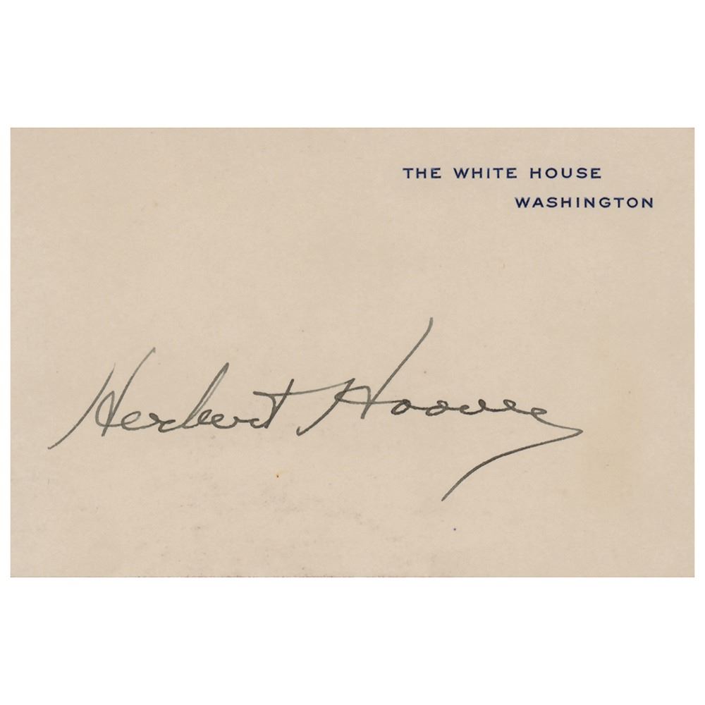 Official White House card, 4.25 x 2.75, signed neatly in fountain pen by President Herbert Hoover. In fine condition, with some old mounting remnants on the back.