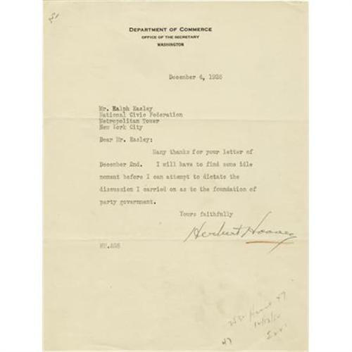 <B>Herbert Hoover Typed Letter Signed as Secretary of Commerce</B></I> “<I>Herbert Hoover</B></I>”. One page, 8” x 10.5”, on Department of Commerce letterhead, Washington, December 4, 1926, to Mr. Ralph Easley, New York. Hoover writes: “Many thanks for your letter of December 2nd. I will have to find some idle moment before I can attempt to dictate the discussion I carried on as to the foundation of party government.” Paper is lightly toned, with the usual fold creases, a red pencil has been used to underline Hoover's signature, else very good. <I>Ex. Henry E. Luhrs Collection.</B></I> <BR><BR><b>Shipping:</b> Flat Material, Small (<a target="_blank" href="http://www.heritageauctions.com/common/shipping.php">view shipping information</a>)