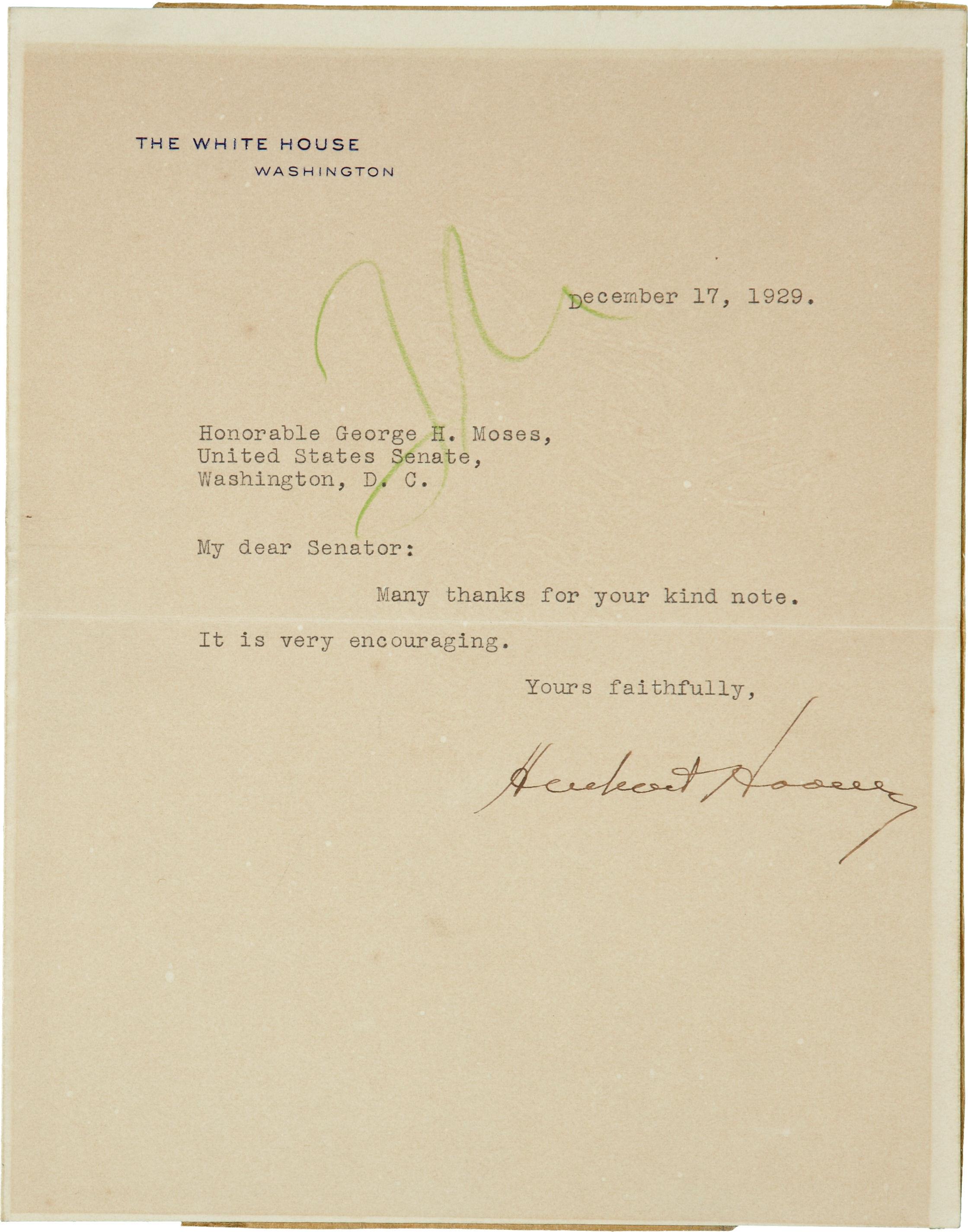 Herbert Hoover typed letter signed as President to U.S. Senator George Moses of New Hampshire. On ''The White House'' letterhead dated 17 December 1929, Hoover writes in full, ''My dear Senator: / Many thanks for your kind note. It is very encouraging. Very faithfully, Herbert Hoover.'' 7'' x 8.75'' letter toned from previous framing. Mounting remnants to verso on fourth page. Light green marks to top of first page. Overall good condition. With accompanying engraving.