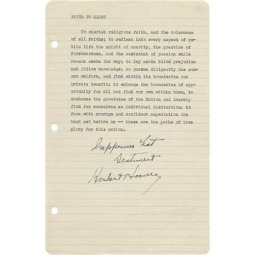 <B>Herbert Hoover Typed Excerpt from His Memorial Day Address at Gettysburg in 1930 Signed.</B></I> TQS, 1 page small loose-leaf binder sheet, 5.5" x 8.5", n.p., n.d. In part: <I>To cherish religious faith, and the tolerance of all faiths; to reflect into every aspect of public life the spirit of charity, the practice of forbearance, and the restraint of passion while reason seeks the way these are the paths of true glory for this nation.</B></I>" Hoover signs beneath: "<I>I approve that sentiment Herbert Hoover</B></I>". Single vertical fold and a few light creases, otherwise very good. <I>From the collection of Henry E. Luhrs</B></I><BR><BR><b>Shipping:</b> Flat Material, Small (<a target="_blank" href="http://www.heritageauctions.com/common/shipping.php">view shipping information</a>)