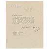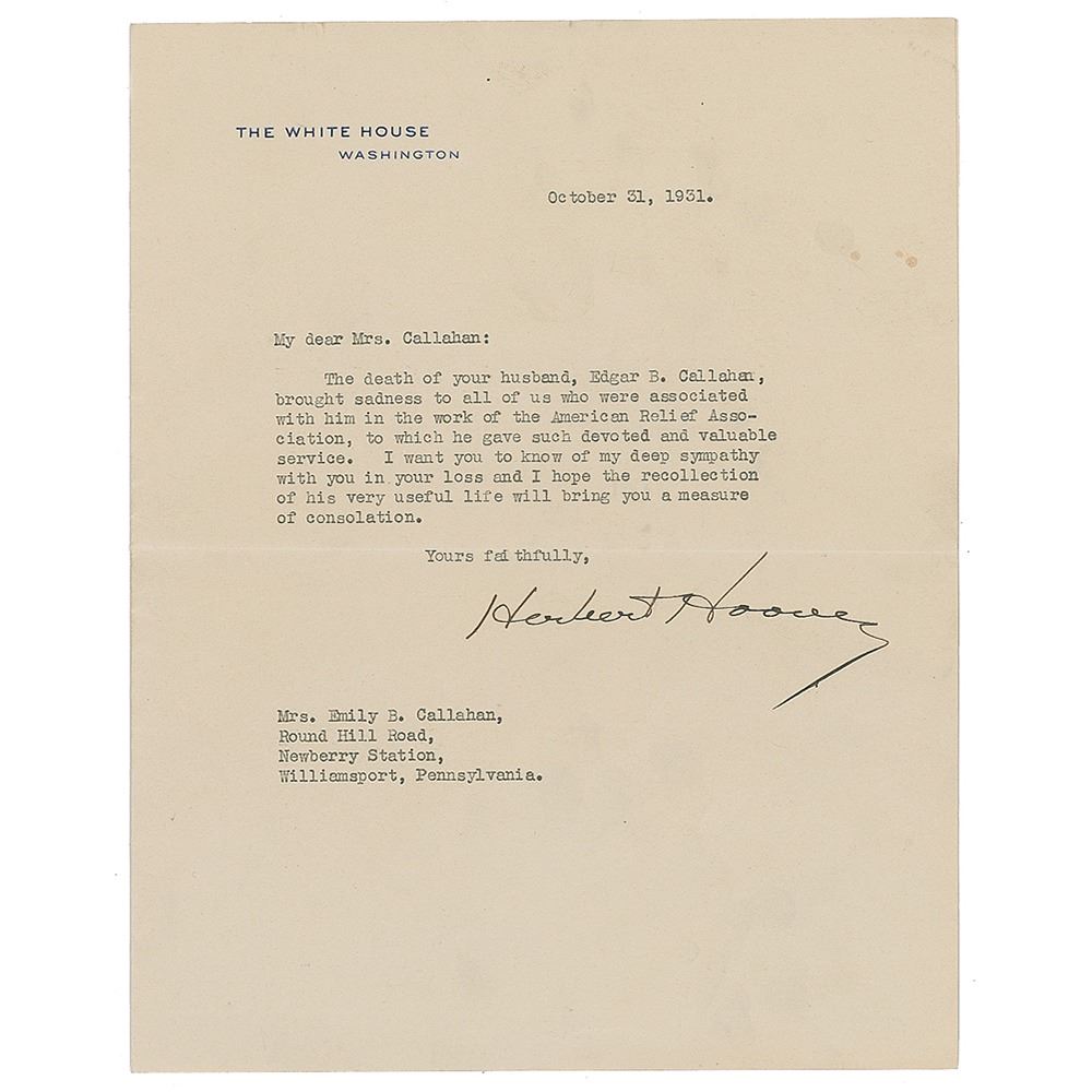 TLS as president, one page, 7 x 8.75, White House letterhead, October 31, 1931. Letter to Emily B. Callahan, in part: "The death of your husband, Edgar B. Callahan, brought sadness to all of us who were associated with him in the work of the American Relief Association, to which he gave such a devoted and valuable service. I want you to know of my deep sympathy with you in your loss and I hope the recollection of his very useful life will bring you a measure of consolation." In fine condition, with a few small stains. Accompanied by the original mailing envelope.