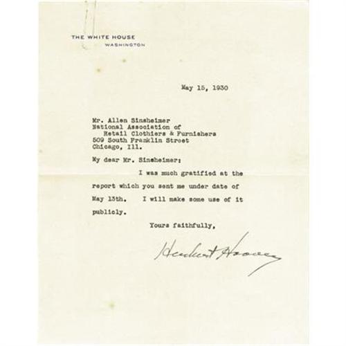 <B>Herbert Hoover as President Typed Letter Signed,</B></I> one page on White House letterhead, 7" x 9", Washington, D.C., May 15, 1930, to Allen Sinsheimer of Chicago, Illinois. The letter reads in full: "<I>I was much gratified at the report which you sent me under date of May 13th. I will make some use of it publicly.</B></I>" With original stamped envelope. In near fine condition, with a few minor stains and smoothed folds. The recipient of Hoover's letter was with the National Association of Retail Clothiers & Furnishers; it is highly likely he was passing on some ill news to the President as the Depression's shadow grew longer.<BR><BR><b>Shipping:</b> Flat Material, Small (<a target="_blank" href="http://www.heritageauctions.com/common/shipping.php">view shipping information</a>)