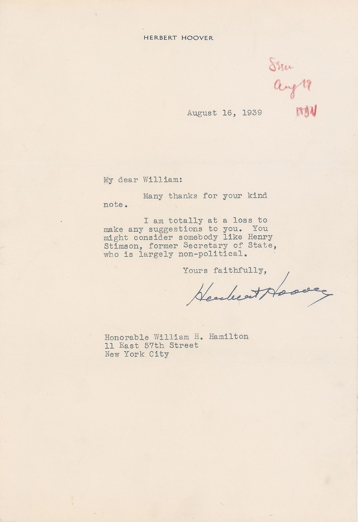 TLS, one page, 7.25 x 10.5, personal letterhead, August 16, 1939. Letter to William H. Hamilton, in part: "I am totally at a loss to make any suggestions to you. You might consider somebody like Henry Stimson, former Secretary of State, who is largely non-political." In fine condition.