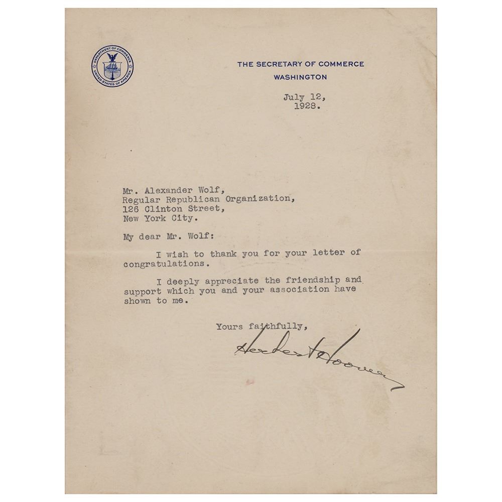 TLS, one page, 6.75 x 9, Secretary of Commerce letterhead, July 12, 1928. Letter to Alexander Wolf of the Regular Republican Organization, sent shortly after Hoover's nomination as the 1928 Republican presidential candidate. In full: "I wish to thank you for your letter of congratulations. I deeply appreciate the friendship and support which you and your association have shown to me." In very good to fine condition, with some light creasing and soiling. Accompanied by an unsigned engraving.