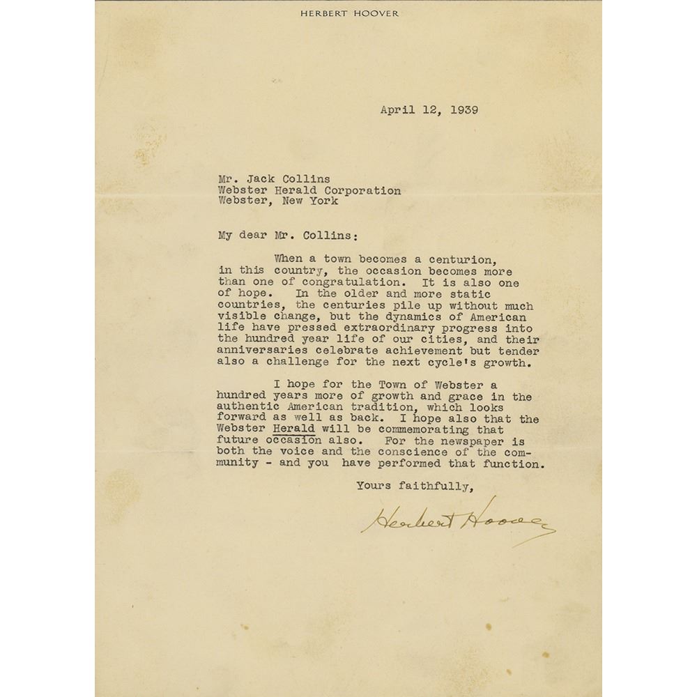 TLS, one page, 7.25 x 10, personal letterhead, April 12, 1939. Letter to Jack Collins of the Webster Herald Corporation, in part: "When a town becomes a centurion, in this country, the occasion becomes more than one of congratulations. It is also one of hope. In the older and more static countries, the centuries pile up without much visible changes, but the dynamics of American life have pressed extraordinary progress into the hundred year life of our cities, and their anniversaries celebrate achievement but tender also a challenge for the next cycle's growth. I hope for the Town of Webster a hundred years more of growth and grace in the authentic American tradition, which looks forward as well as back." In fine condition, with scattered small stains.