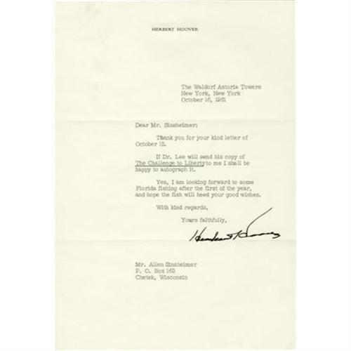 <B>Herbert Hoover Typed Letter Signed</B></I> “<I>Herbert Hoover</B></I>”. One page, 7.25” x 10.5”, on his personal letterhead, New York, October 16, 1961, to Allen Sinsheimer, Chetek, Wisconsin, with original transmittal envelope. Addressed to friend and fellow Republican, Allen Sinsheimer, Hoover writes in part: “…Yes, I am looking forward to some Florida fishing after the first of the year, and hope the fish will heed your good wishes.” With the usual fold creases, else near fine. <BR><BR><b>Shipping:</b> Flat Material, Small (<a target="_blank" href="http://www.heritageauctions.com/common/shipping.php">view shipping information</a>)