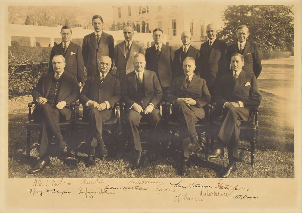 Fabulous sepia matte-finish 20 x 13.5 portrait of President Herbert Hoover and his entire cabinet by Schutz, signed in the lower border in fountain pen by all depicted: President "Herbert Hoover," Treasury Secretary “Ogden L. Mills,” Vice President “Charles Curtis,” Attorney General “William D. Mitchell,” Postmaster General “Walter F. Brown,” Secretary of the Navy “C. F. Adams,” Agriculture Secretary “Arthur M. Hyde,” Labor Secretary “W. N. Doak,” Commerce Secretary “Roy D. Chapin,” Interior Secretary “Ray Lyman Wilbur,” Secretary of State “Henry L. Stimson,” and Secretary of War “Patrick J. Hurley.” Reverse bears a Schutz studio credit stamp. In fine condition, with light rippling, and a small gouge to Stinson's middle initial. Accompanied by a full letter of authenticity from PSA/DNA.