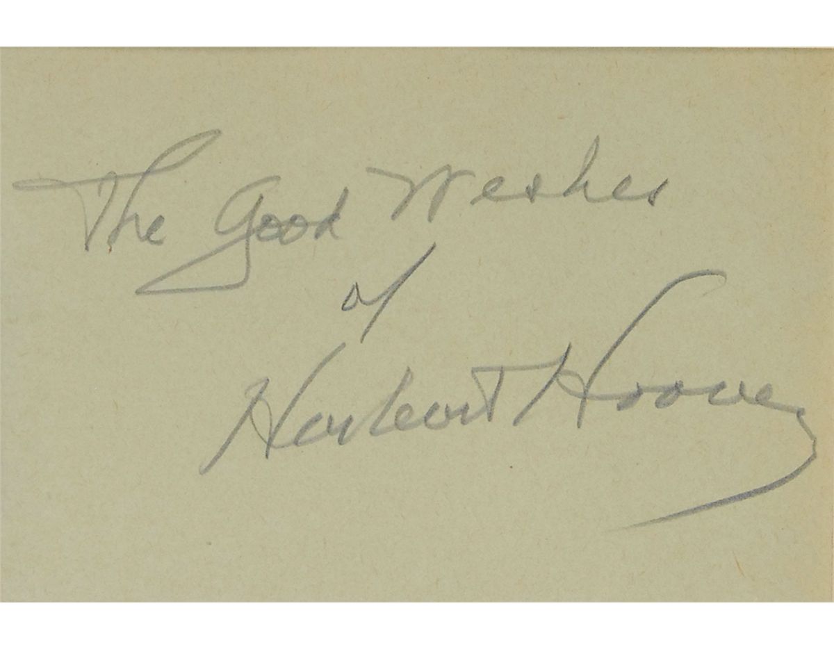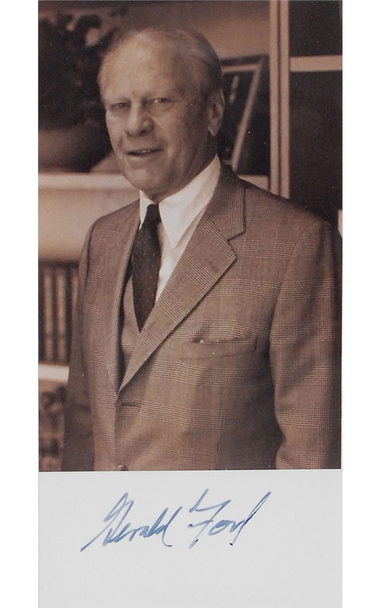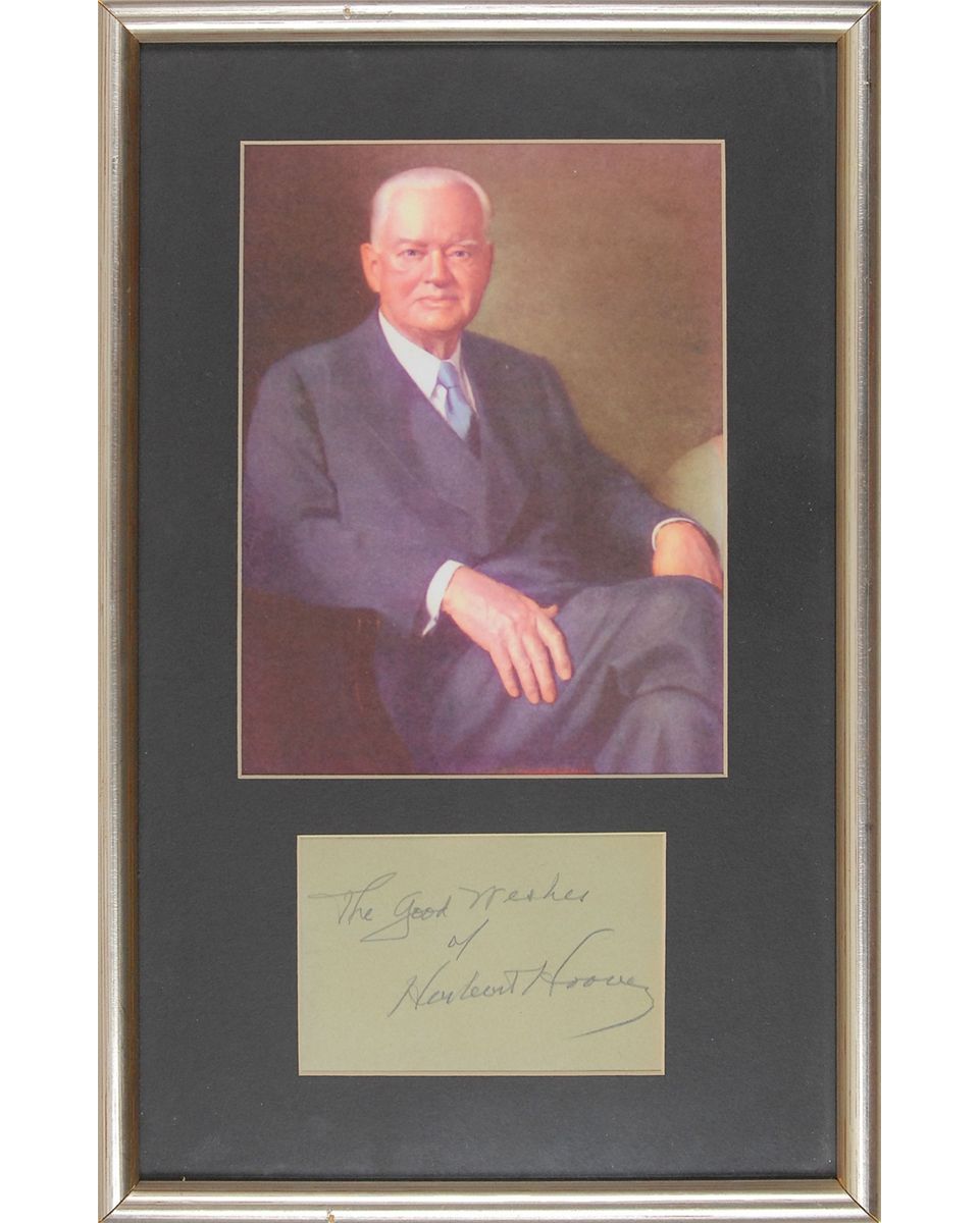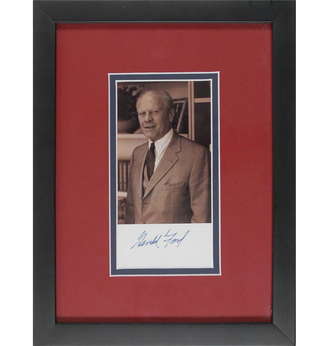 Two items: pencil signature, “The good wishes of Herbert Hoover,” on a green album page. Matted and framed with a color portrait to an overall size of 9.75 x 15.25; and a glossy 3.25 x 6.5 photo of Gerald Ford, signed in the lower border in black felt tip. Double-matted and framed to an overall size of 9 x 12. In fine condition.