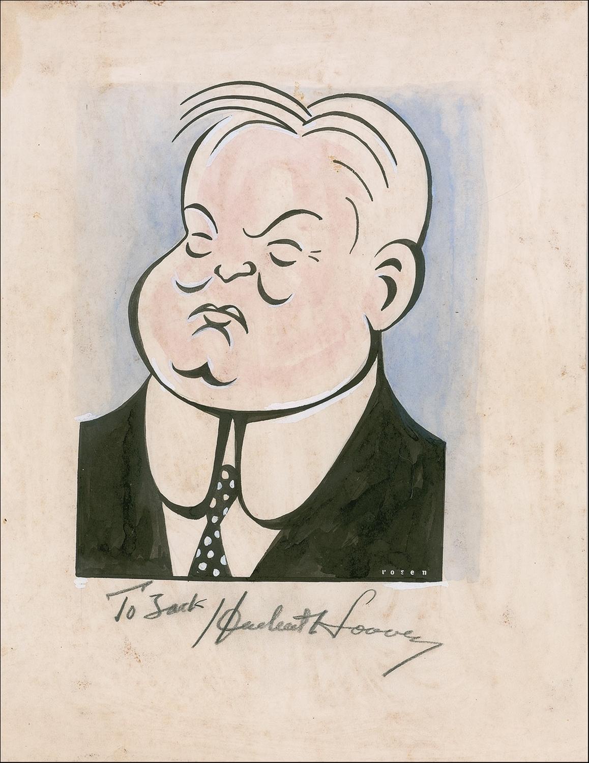 An original ink and watercolor portrait of Herbert Hoover, done by famed caricaturist Jack Rosen on an 8.5 x 11 off-white sheet. Signed and inscribed in the lower border in black artists pencil, “To Jack, Herbert Hoover.” In very good condition, with scattered soiling, and light overall toning from adhesive remnants on reverse.