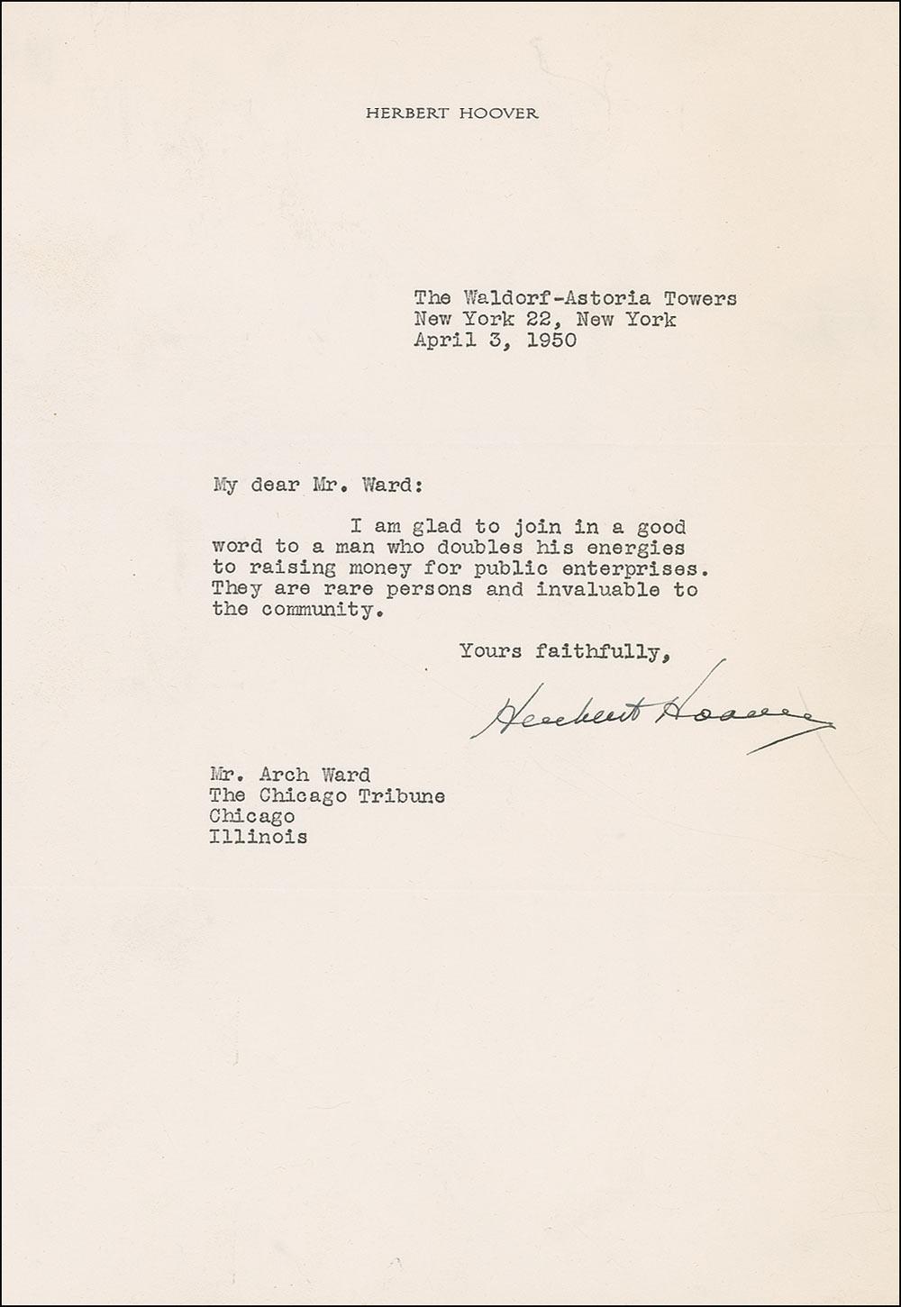 TLS, one page, 7.25 x 10.5, personal letterhead, April 3, 1950. Letter to Arch Ward at the Chicago Tribune. In full: “I am glad to join in a good word to a man who doubled his energies to raising money for public enterprises. They are rare persons and invaluable to the community.” In fine condition.