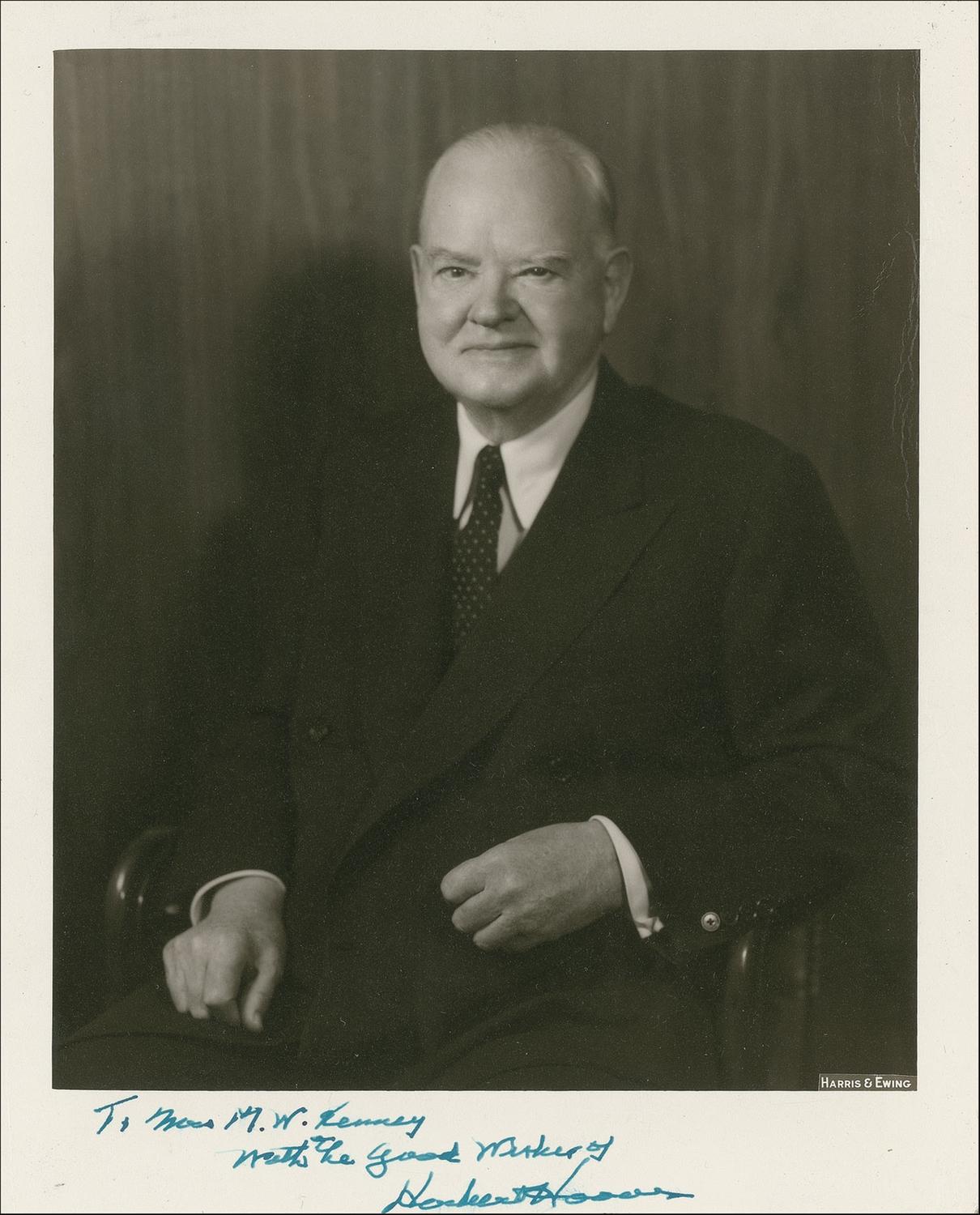 Vintage matte-finish 8 x 10 Harris & Ewing portrait, signed and inscribed in fountain pen along the bottom border “To Mrs. M. W. Kenney, With the good wishes of Herbert Hoover.” In fine condition, with scattered creasing and brushes to a few letters, including his last name.