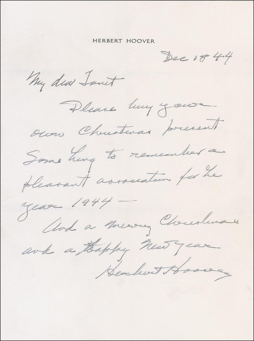 ALS, one page, 5.75 x 8, personal letterhead, December 18, 1944. Letter to Janet Mead. In full: “Please buy your own Christmas present. Something to remember a pleasant association for the year 1944— And a Merry Christmas and a happy New Year.” In fine condition, with a few trivial creases. Accompanied by the original transmittal envelope addressed in Hoover’s hand. Hoover is one of the scarcest of all presidents in handwritten letters.