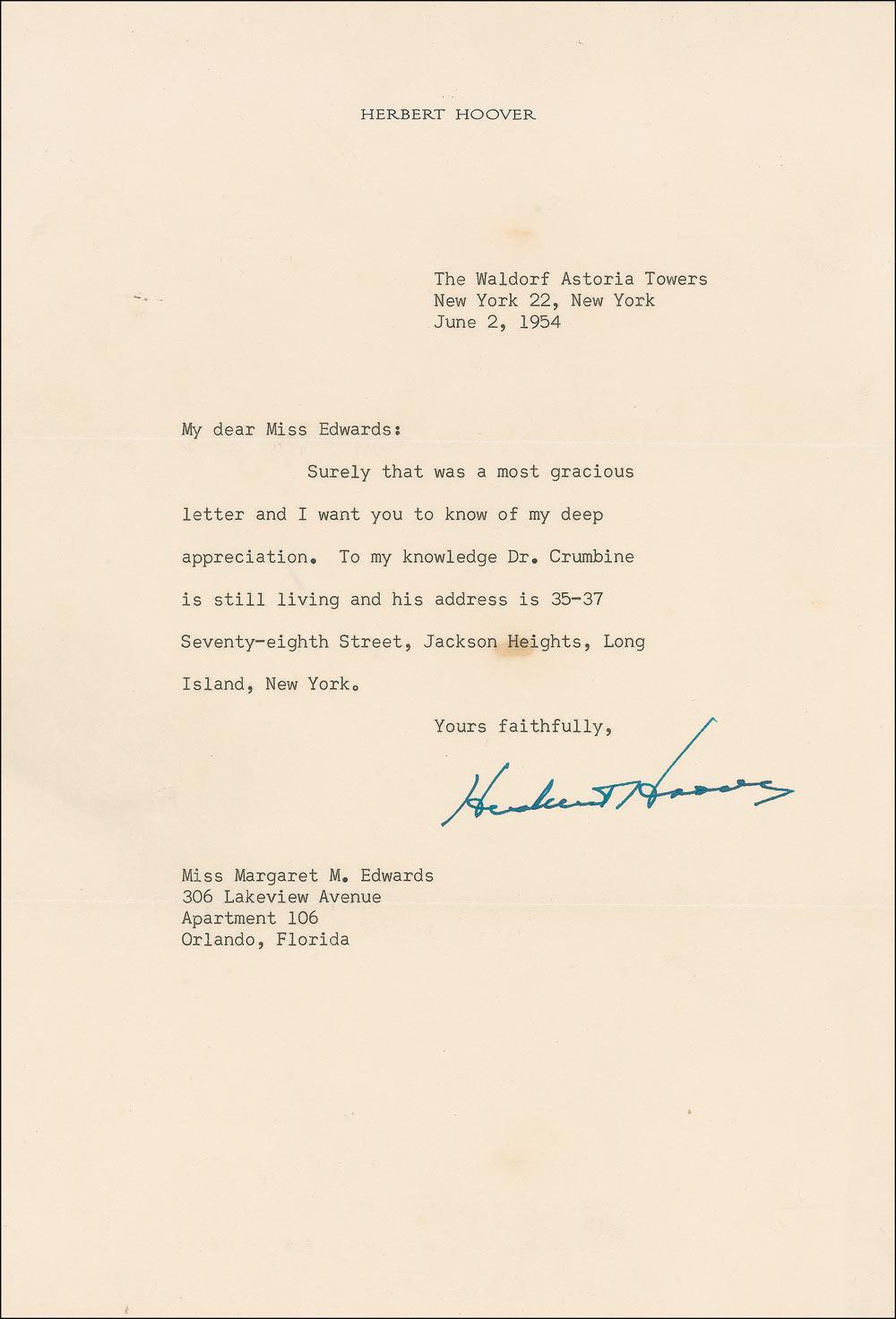 TLS, one page, 7.25 x 10.5, personal letterhead, June 2, 1954. Short letter forwarding information regarding a doctor’s address. In part: “Surely that was a most gracious letter and I want you to know of my deep appreciation.” In fine condition, with a couple of small spots of light toning. Accompanied by the original mailing envelope.