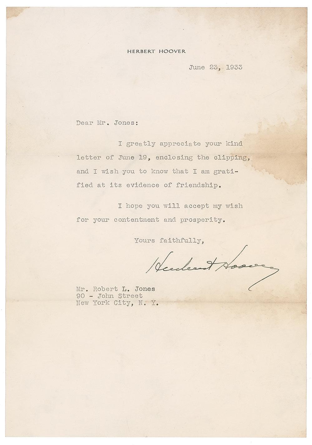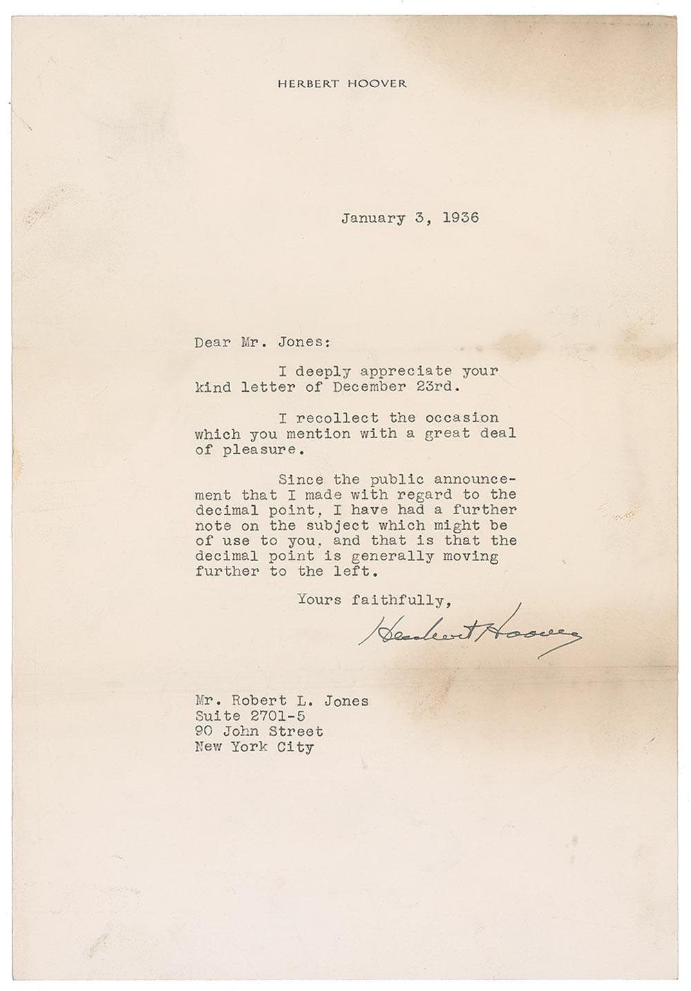 Two TLSs, both one page, 7.25 x 10.5, both on his personal letterhead, dated 1933 and 1936. The latter one reads, in part: “Since the public announcement that I made with regard to the decimal point, I have had a further note on the subject which might be of use to you, and that is that the decimal point is generally moving further to the left.” In very good condition, with scattered toning and damp staining to both. Hoover referred to decimal points several times during his presidency regarding the government’s debt and was also a strong opponent to FDR’s recently unveiled New Deal.