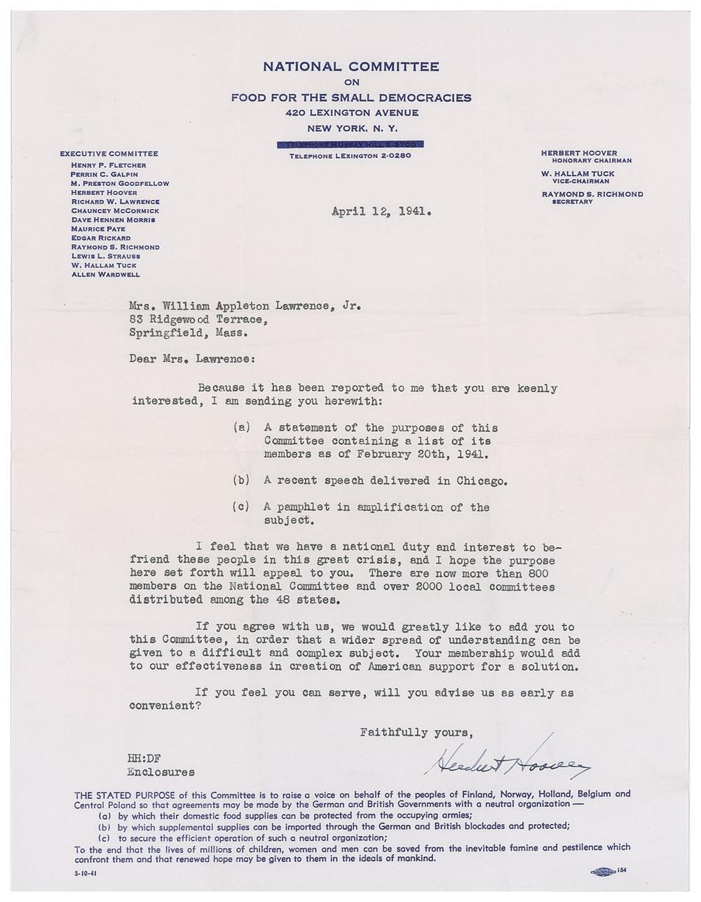 TLS, one page, 8.5 x 11, National Committee on Food for the Small Democracies letterhead, April 12, 1941. The former president and current committee chairman contacts Mrs. William Appleton Lawrence, Jr. in Springfield, Massachusetts. In part: “I feel that we have a national duty and interest to befriend these people in this great crisis, and I hope the purpose here set forth will appeal to you. There are now more than 800 members on the National Committee and over 2000 local committees distributed among the 48 states. If you agree with us, we would greatly like to add you to this Committee, in order that a wider spread of understanding can be given to a difficult and complex subject. Your membership would add to our effectiveness in creation of American support for a solution.” Several somewhat heavy intersecting horizontal and vertical folds with a vertical fold crossing the end of Hoover’s name, and light wrinkling, otherwise fine condition.