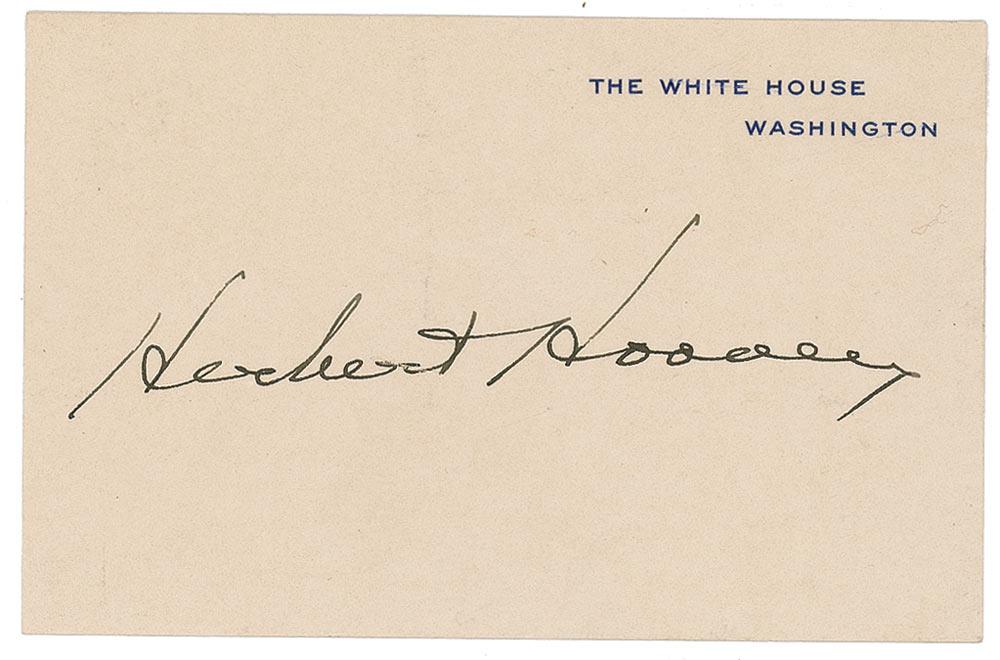 Signed White House card, neatly signed in black ink, “Herbert Hoover.” In fine condition, with a uniform shade of toning and a touch of trivial soiling.