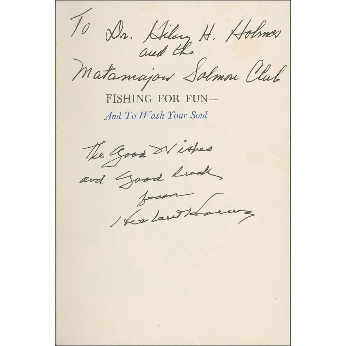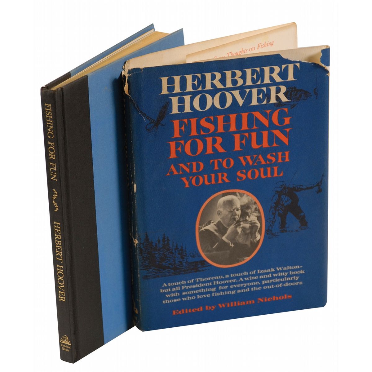 Signed book: Fishing for Fun and To Wash Your Soul. First edition, first printing. NY: Random House, 1963. Hardcover with dustjacket, 5.75 x 8.25, 86 pages. Signed and inscribed on the half-title page, “To Dr. Hilary H. Holmes and the Matamajow Salmon Club, the good wishes and good luck from Herbert Hoover.” In very good condition, with some light toning and soiling to signed page, foxing to fore-edge, and several tears and an area of paper loss to dustjacket.