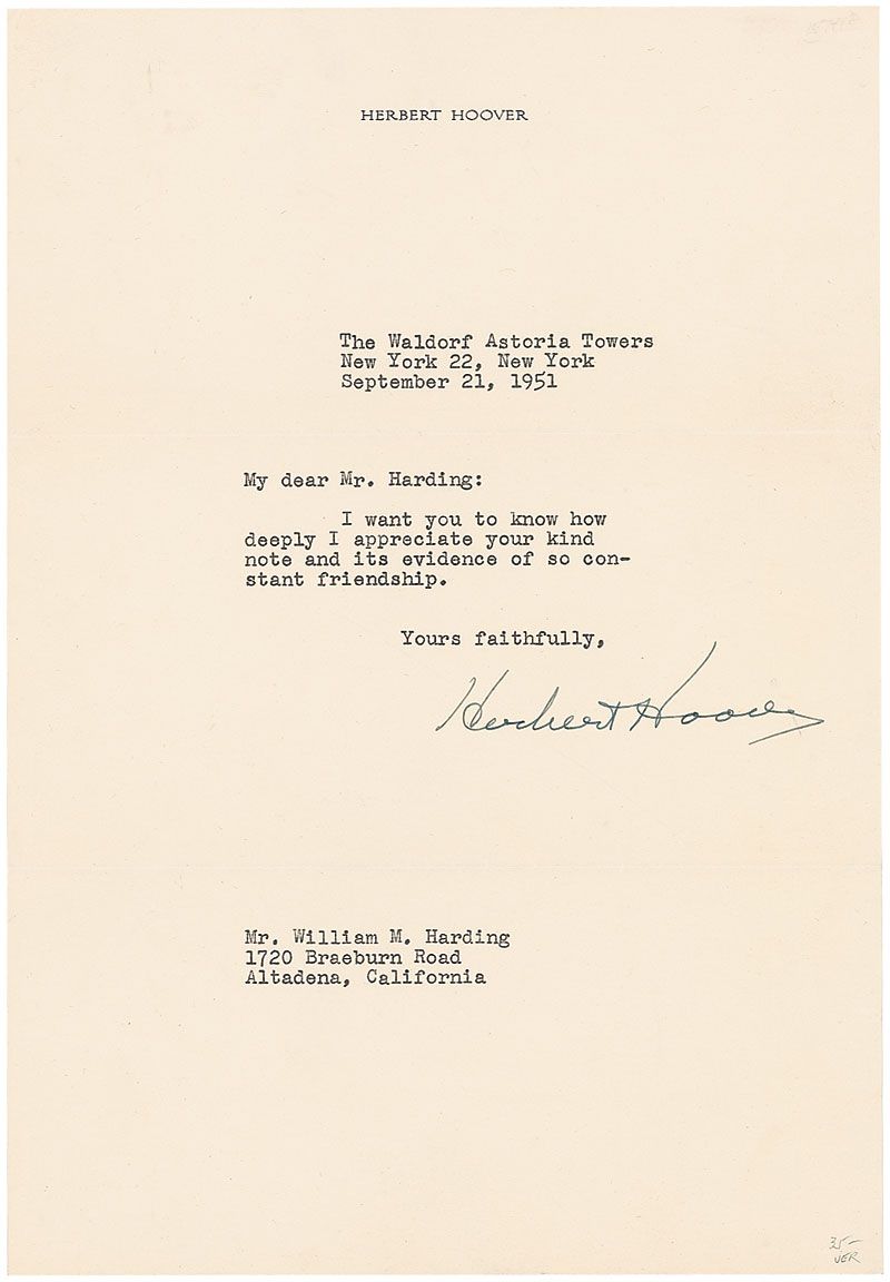 TLS, one page, 7.25 x 10.5, personal letterhead, September 21, 1951. Short letter to William Harding in California. In full: “I want you to know how deeply I appreciate your kind note and its evidence of so constant friendship.” In fine condition.