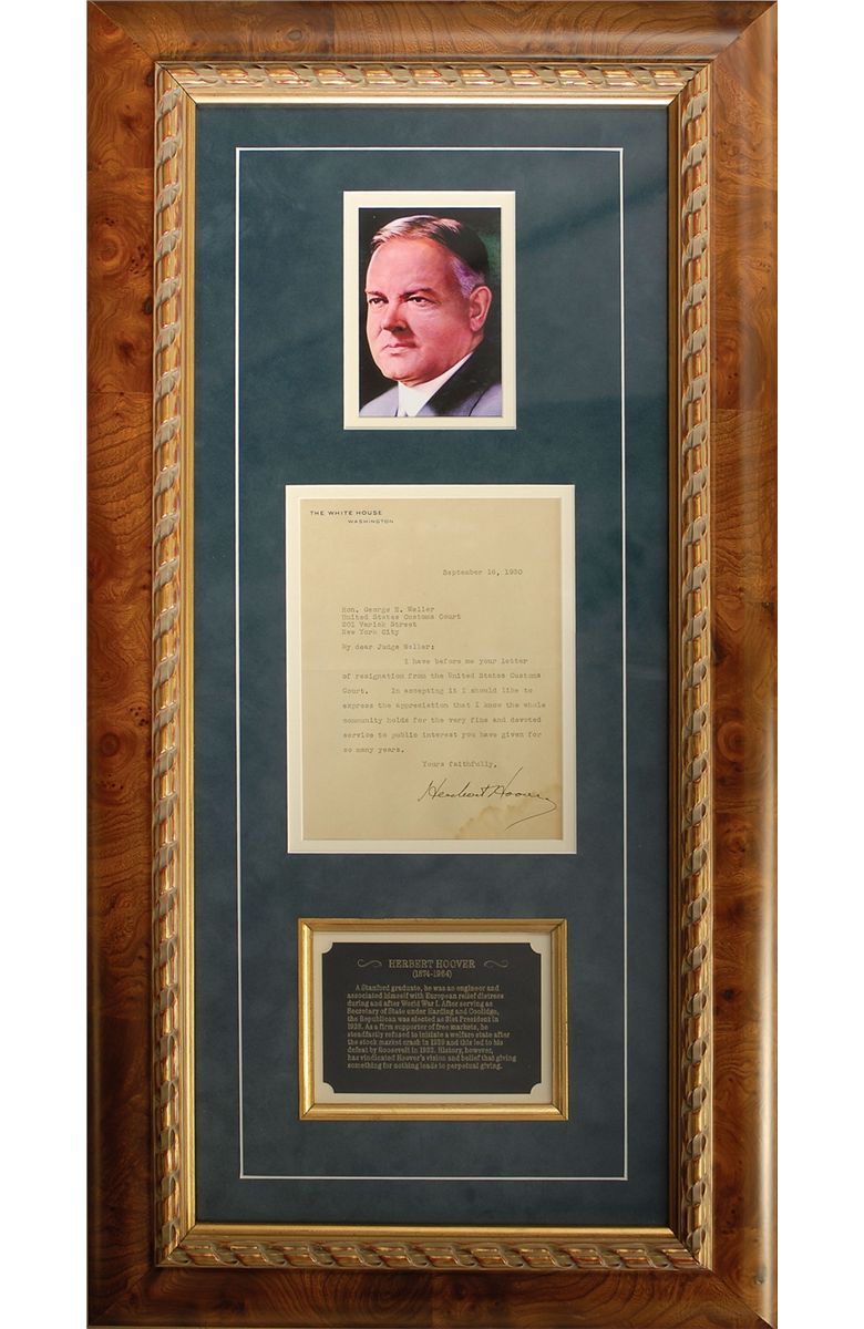 TLS as president, one page, 5.75 x 7.75, White House letterhead, September 16, 1930. Letter to George Weller of the United States Customs Court. In full: “I have before me your letter of resignation from the United States Customs Court. In accepting it I should like to express the appreciation that I know the whole community holds for the very fine and devoted service to the public interest that you have given for so many years.” Double suede matted and framed with a portrait and a biographical plaque to an overall size of 16 x 31. In very good condition, with a uniform shade of toning and some dampstaining to lower right corner affecting the last few letters of signature. Oversized.