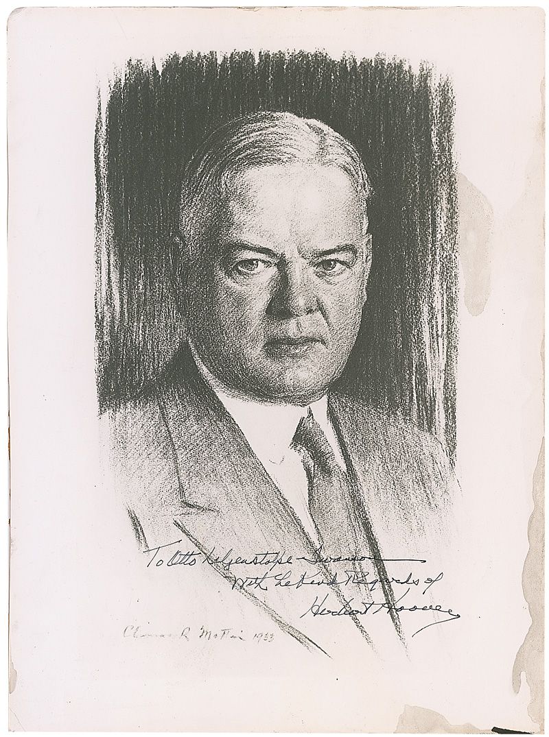 Bust portrait print, 10 x 13.5, signed and inscribed in black ink, “To Otto Liljeastolpe Swanson, With the kind regards of Herbert Hoover.” Print is affixed to an identical size board. In very good condition, with scattered soiling, mainly to right border, and scattered edge wear.