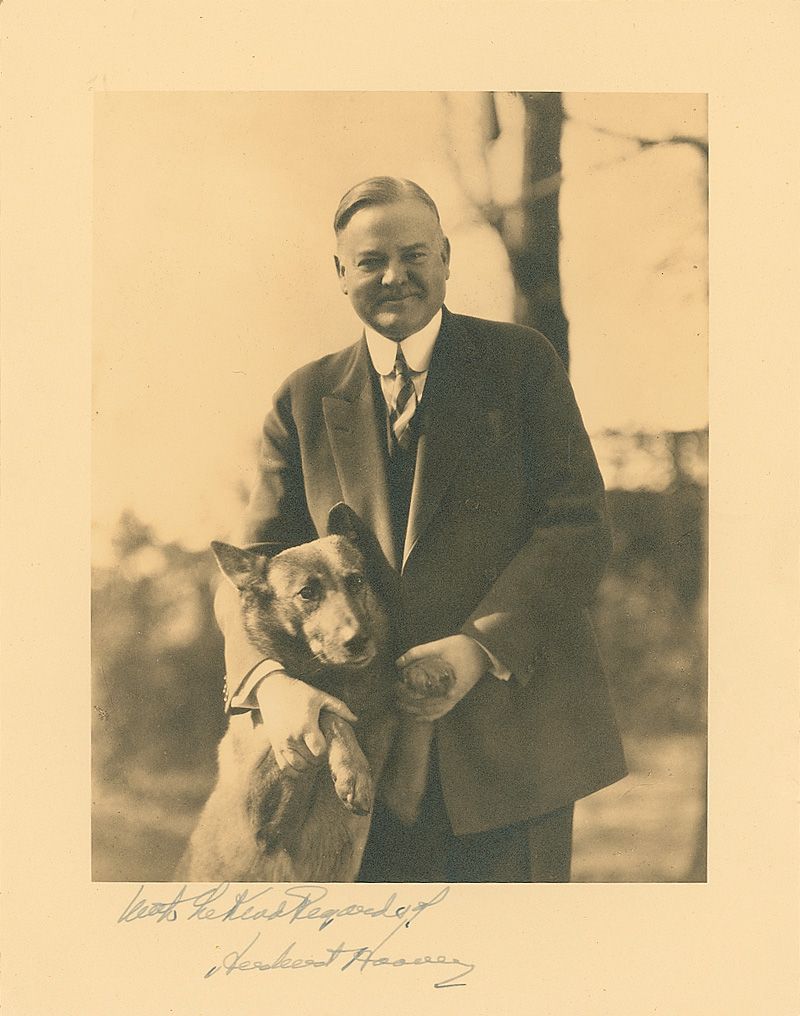 Vintage matte-finish 7.5 x 9.5 photo of Hoover and one of his dogs, signed in the lower border in fountain pen, “With the kind regards of Herbert Hoover.” In fine condition, with some scattered light silvering, mostly visible only at an angle.