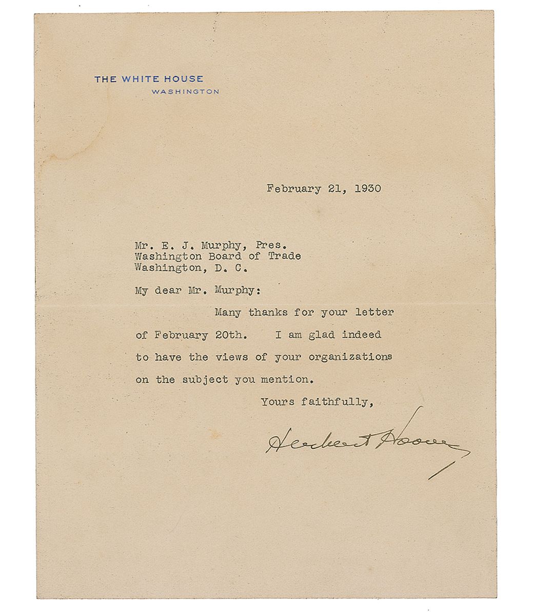 TLS as president, one page, 7 x 9, White House letterhead, February 21, 1930. Hoover writes to E. J. Murphy, President of the Washington Board of Trade, in full: “Many thanks for your letter of February 20th. I am glad indeed to have the views of your organizations on the subject you mention.” In fine condition, with uniform toning and a bit of dampstaining.