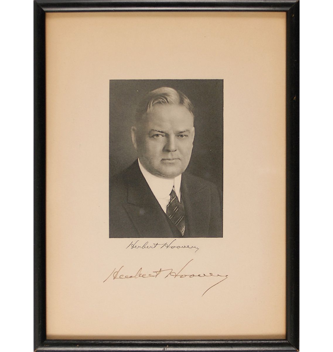 Vintage 7 x 9.25 cardstock photo of Hoover, signed in black ink beneath a printed signature. Framed to an overall size of 7.5 x 10. In fine condition, with light uniform toning.