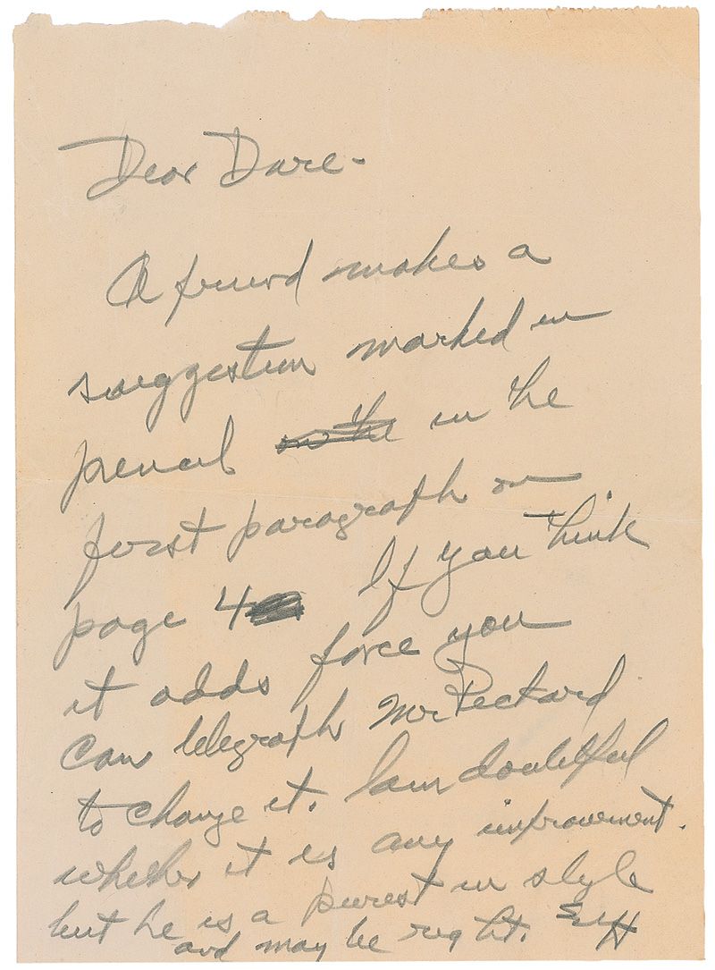 Rare ALS, in pencil, signed “H,” one page, 6 x 8.5, no date. Letter to Dave. In full: “A friend makes a suggestion marked in pencil in the first paragraph on page 4. If you think it adds force you can telegraph Mr. Peckard to change it. I am doubtful whether it is any improvement, but he is a purist in style and may be right.” In very good condition, with central horizontal and vertical folds, scattered creases and wrinkles, and a rough top edge.