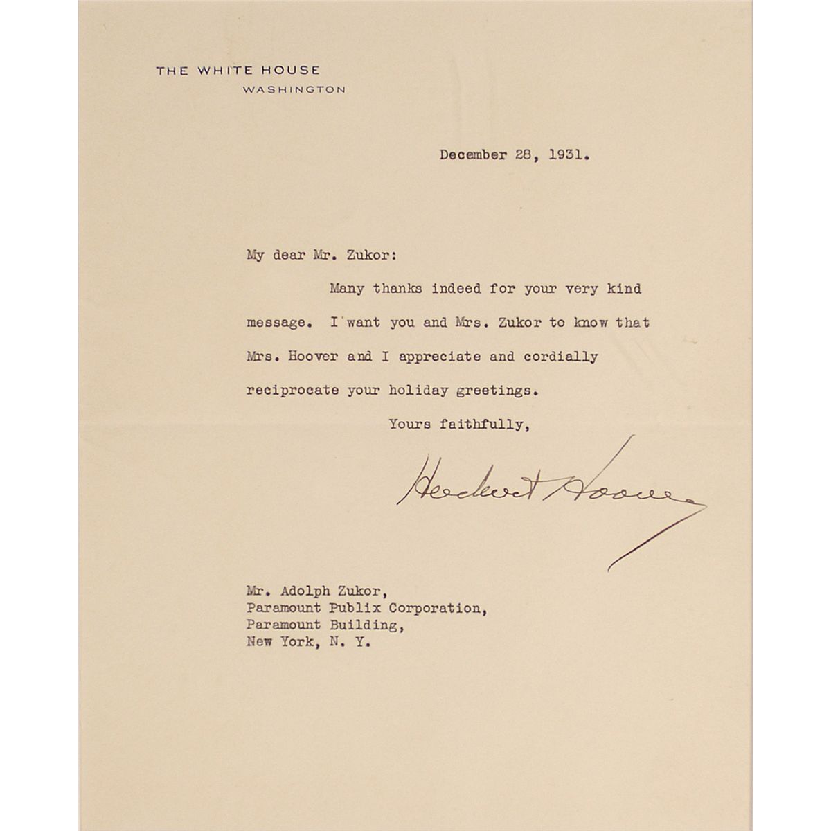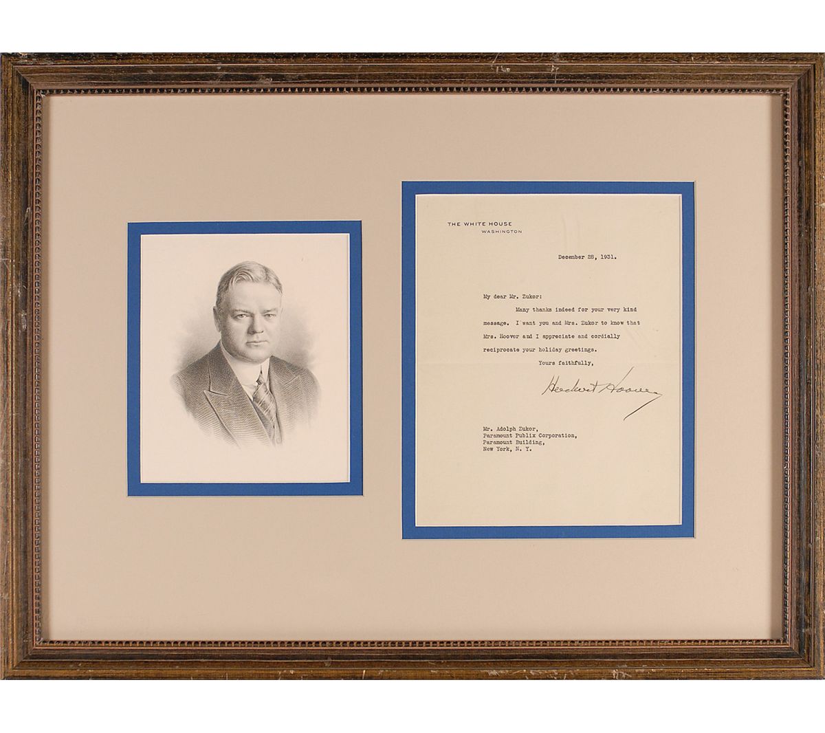 TLS as president, one page, 6.75 x 8.5, White House letterhead, December 28, 1931. Letter of thanks to Paramount head Adolph Zukor. In full: “Many thanks indeed for your very kind message. I want you and Mrs. Zukor to know that Mrs. Hoover and I appreciate and cordially reciprocate your holiday greetings.” Double matted and framed with an engraved portrait of Hoover to an overall size of 21 x 16. In fine condition.