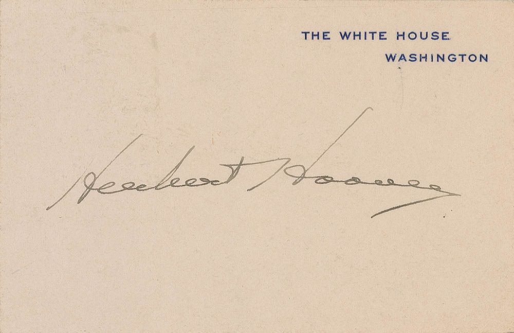 White House card, 4.25 x 2.75, neatly signed in black ink, “Herbert Hoover.” In fine condition, with a mild overall shade of toning.
