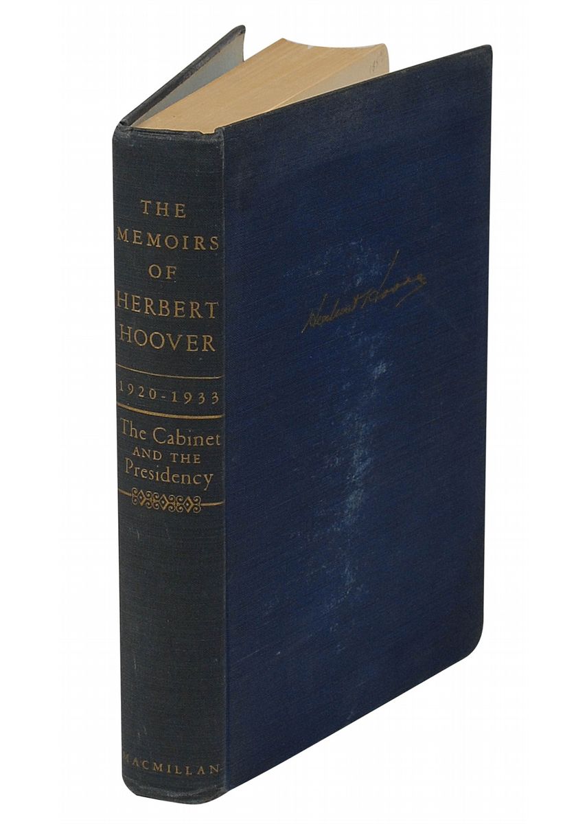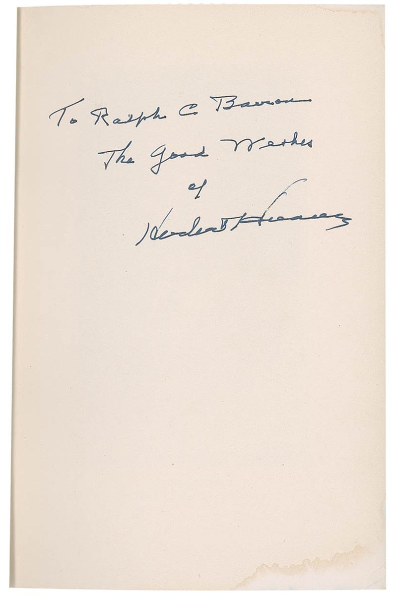 Signed book: The Memoirs of Herbert Hoover. First edition, first printing. NY: Macmillan Company, 1952. Hardcover, 6.25 x 9.5, 405 pages. Signed and inscribed on the second free end page, “To Ralph C. Barron, The good wishes of Herbert Hoover.” In very good condition, with some light dampstaining to edges of signed page, owner’s bookplate affixed to first free end page, toning to last page and rear pastedown, and scattered light wear to covers and spine.