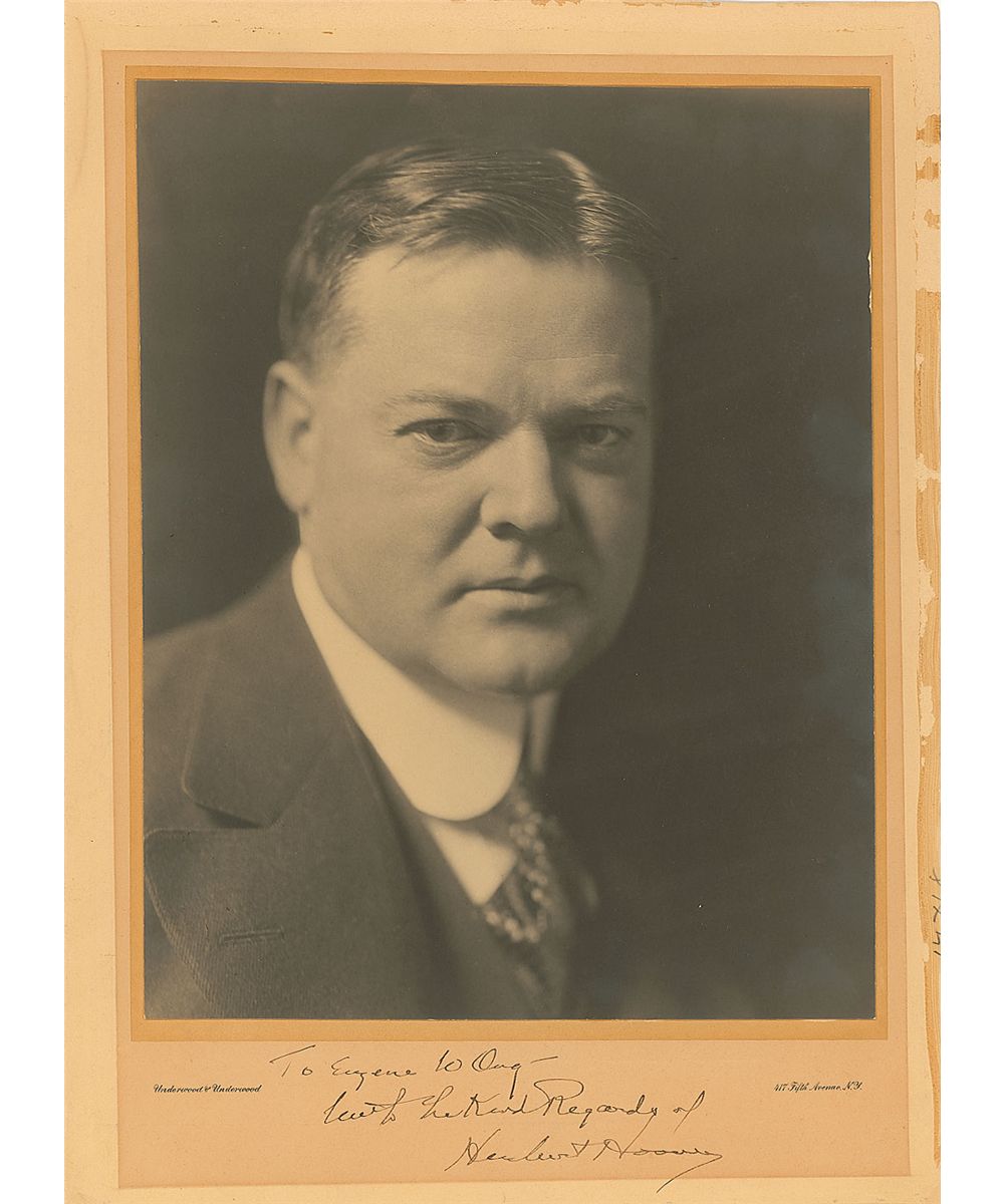 Handsome vintage matte-finish 9 x 11.5 portrait affixed to its original 11 x 15 Underwood & Underwood mount, signed and inscribed on the mount in black ink, “To Eugene W. Ong—With the kind regards of Herbert Hoover.” In very good condition, with a moderate block of toning over the signature and inscription, adhesive remnants and surface loss to mount’s borders, lightly trimmed edges, light silvering to dark areas of the image, and photo mostly detached from mount, which could be easily repaired. Most flaws could be matted out for stunning display.