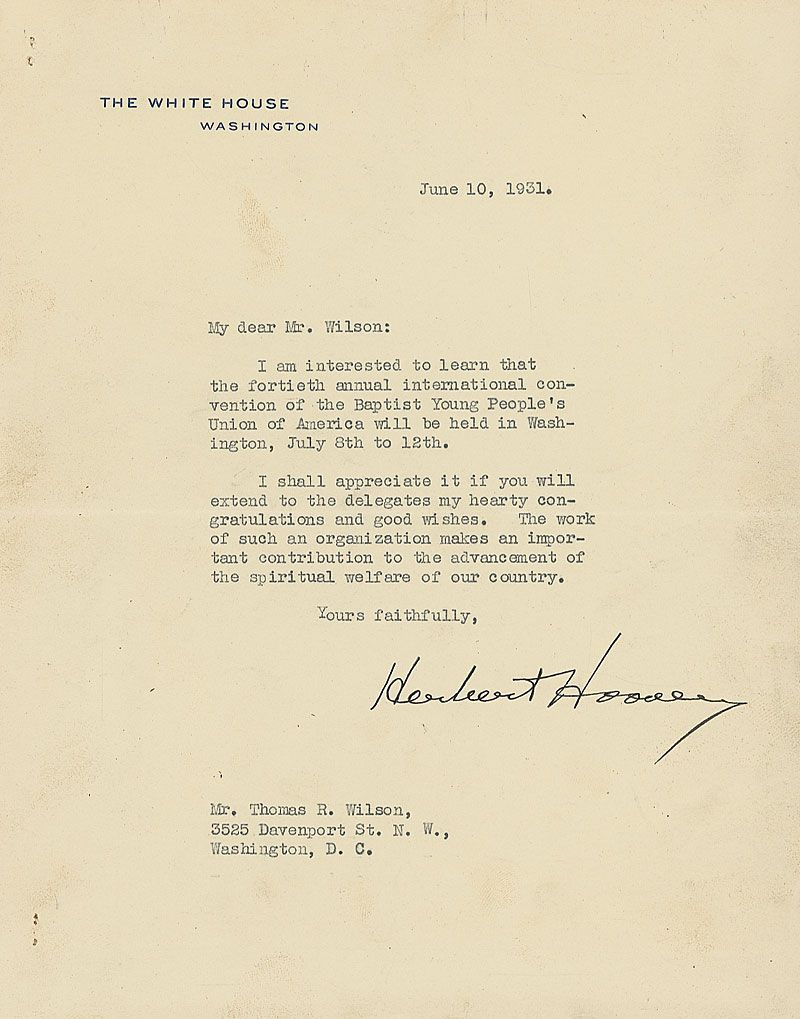 TLS as president, one page, 7 x 8.75, White House letterhead, June 10, 1931. Letter to Thomas R. Wilson. In full: “I am interested to learn that the fortieth annual international convention of the Baptist Young People’s Union of America will be held in Washington, July 8th to 12th. I shall appreciate it if you will extend to the delegates my hearty congratulations and good wishes. The work of such an organization makes an important contribution to the advancement of the spiritual welfare of our country.” In fine condition, with scattered light soiling and staple holes to left edge near corners. Accompanied by three related letters, including one from the president’s secretary about a group photograph being taken at the White House. The Baptist Young People’s Union of America was organized in 1891 with its first headquarters in Chicago.