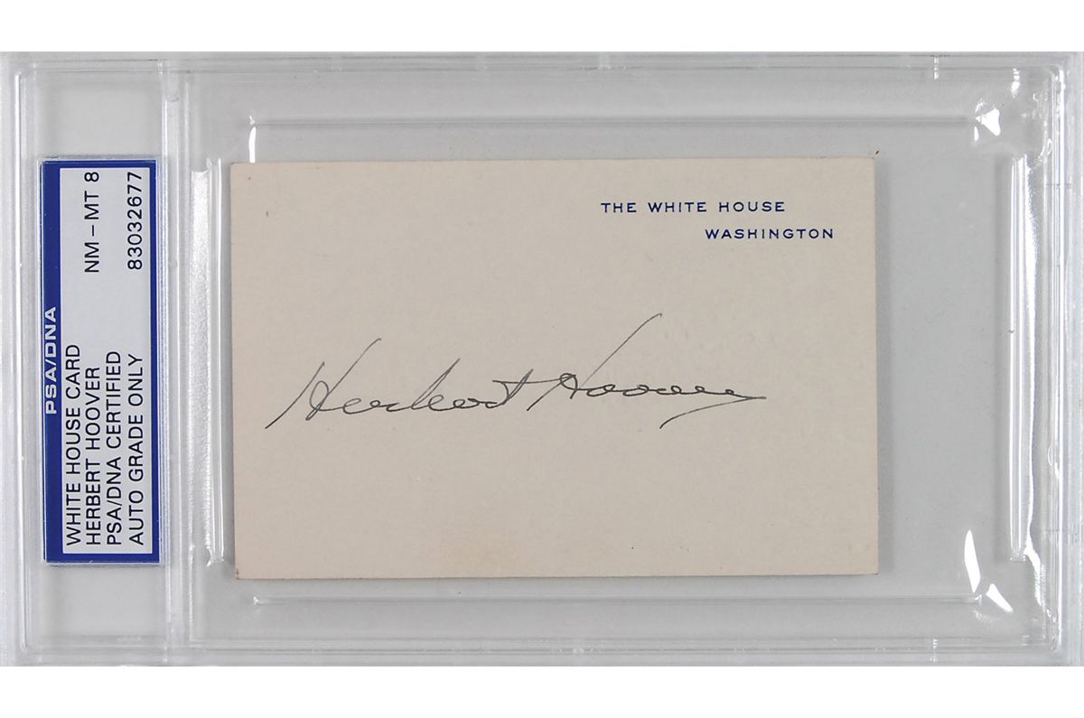 White House card crisply signed in fountain pen, “Herbert Hoover.” Encapsulated in a plastic PSA/DNA authentication holder, grading the autograph an “8.” In fine condition, with two small areas of mounting remnants to reverse.