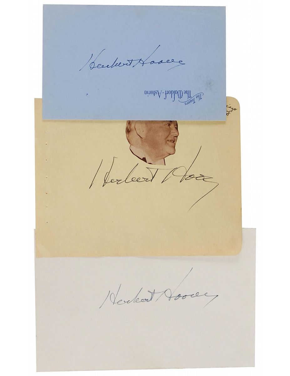 Three fountain pen signatures, “Herbert Hoover,” on various size cards and album pages, one with a small clipped photo of Hoover affixed above the signature. In overall fine condition.