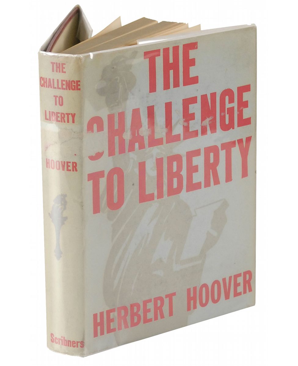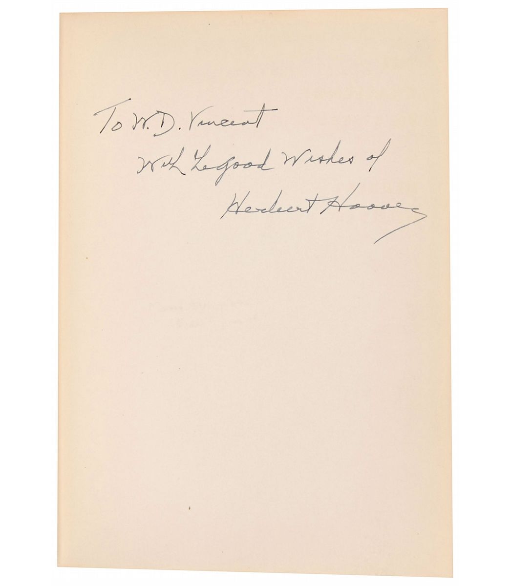 Signed book: The Challenge to Liberty. First edition, first printing. NY: Charles Scribner's Sons, 1934. Hardcover with dust jacket, 5.75 x 8, 212 pages. Signed and inscribed on the first free end page in fountain pen, “To W. D. Vincent, with the good wishes of Herbert Hoover.” Autographic condition: fine, with faint remnants of an erased pencil notation on signed page. Book condition: VG+/VG-.