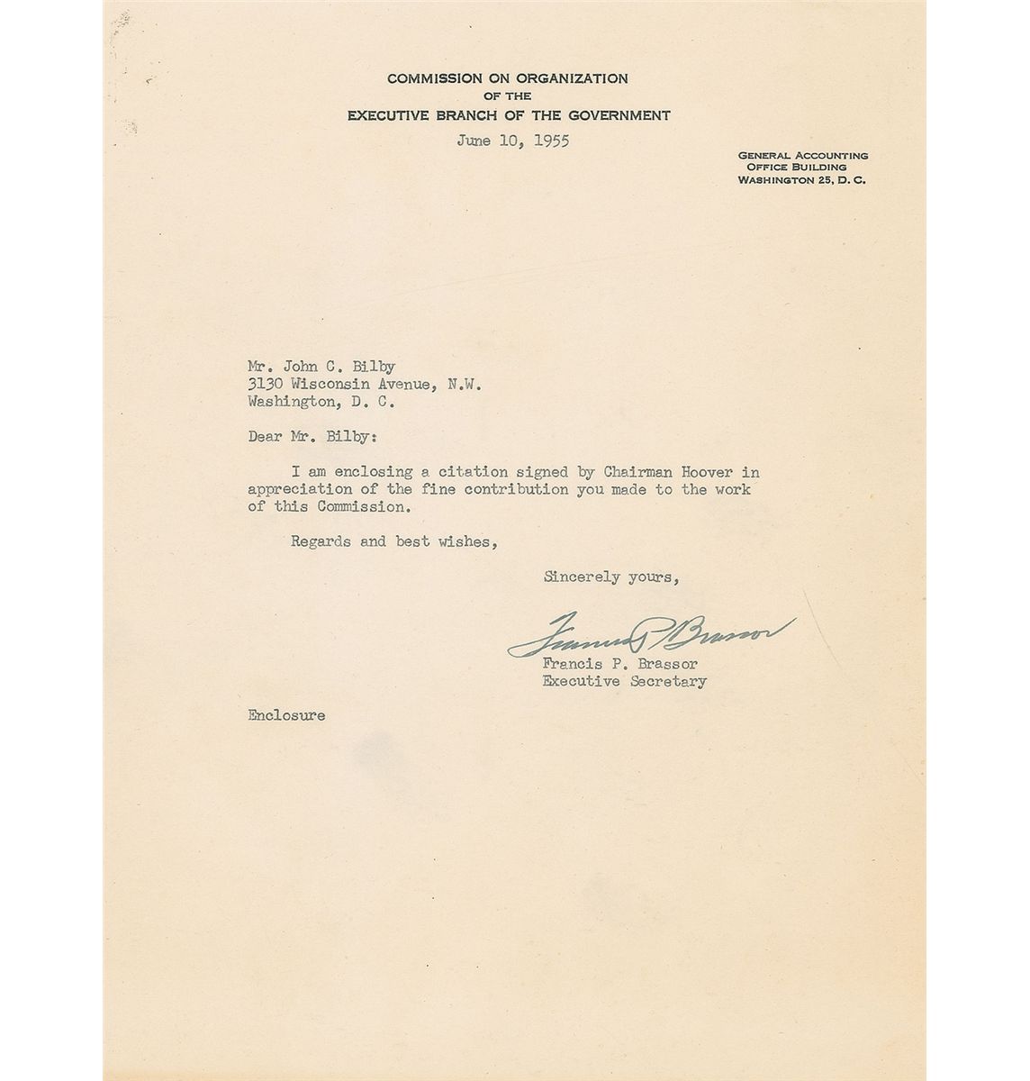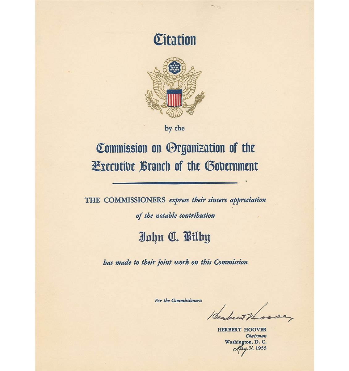 DS, one page, 9 x 12, May 31, 1955. Citation issued to John C. Bilby for his contributions to the Commission on Organization of the Executive Branch of the Government. Boldly signed at the conclusion by Hoover. In fine condition. Accompanied by a June 10, 1955, letter from the commission’s executive secretary sending the citation.