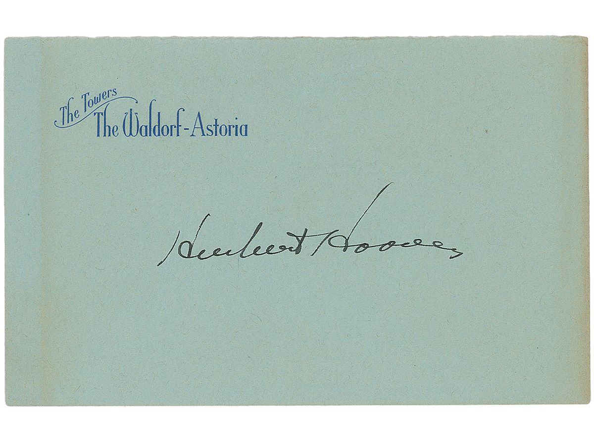 Ink signature, “Herbert Hoover,” on a light blue 5.25 x 3.25 sheet of Waldorf-Astoria stationery. In fine condition, with a uniform shade of light toning from previous display.