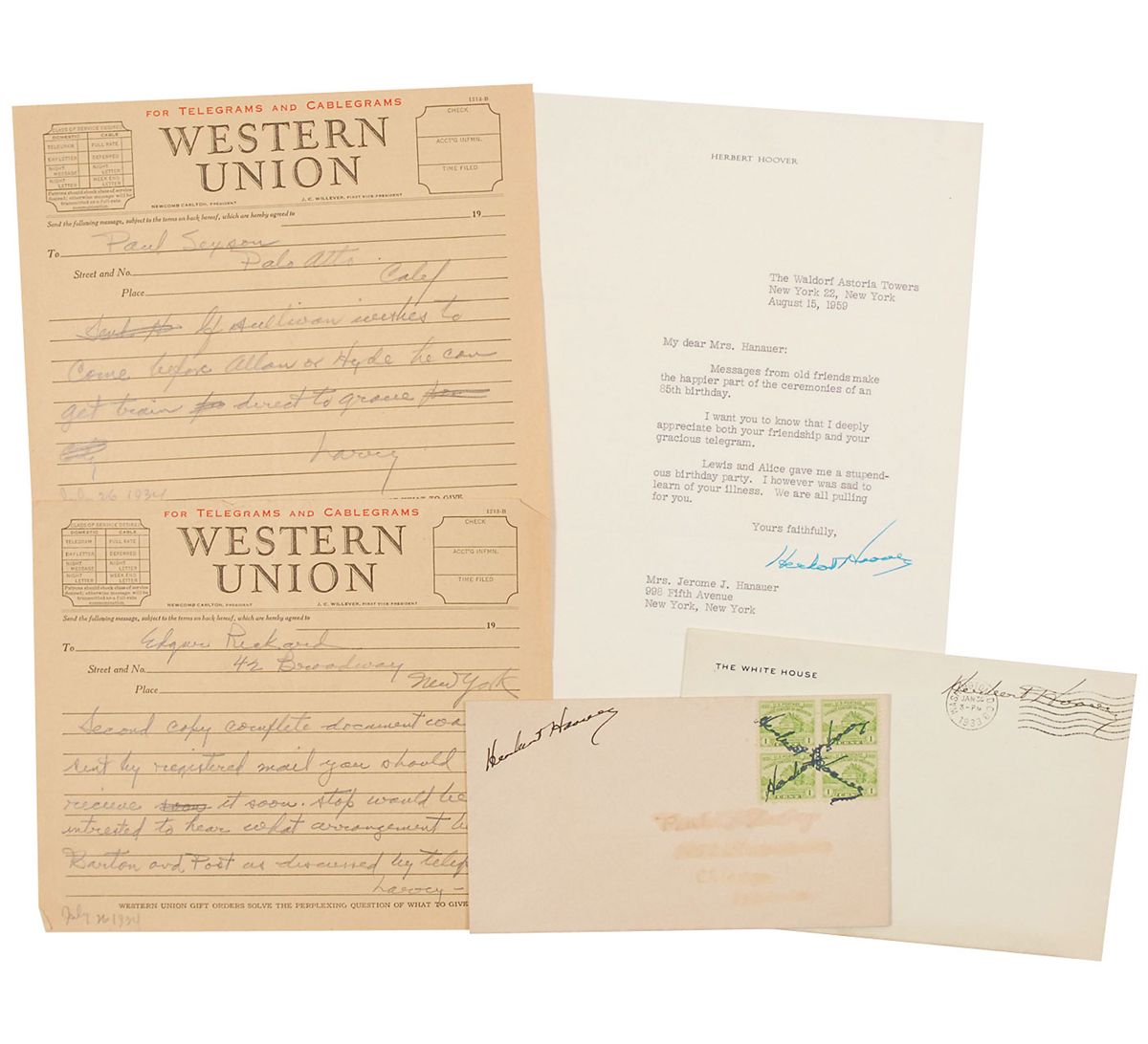 An uncommon grouping of five items: an unusual mailing envelope signed once in the upper left and twice over the stamp block in the shape of an ‘X’; a free-franked White House envelope, postmarked 1933; a 1959 TLS thanking a friend for birthday wishes; and two handwritten telegram drafts in pencil, each one page, dated July 26, 1934, written entirely in Hoover's hand but signed "Larry" (presumably on behalf of his assistant, Larry Richey). One, in part: "Second copy complete document was sent by registered mail." In overall very good to fine condition.