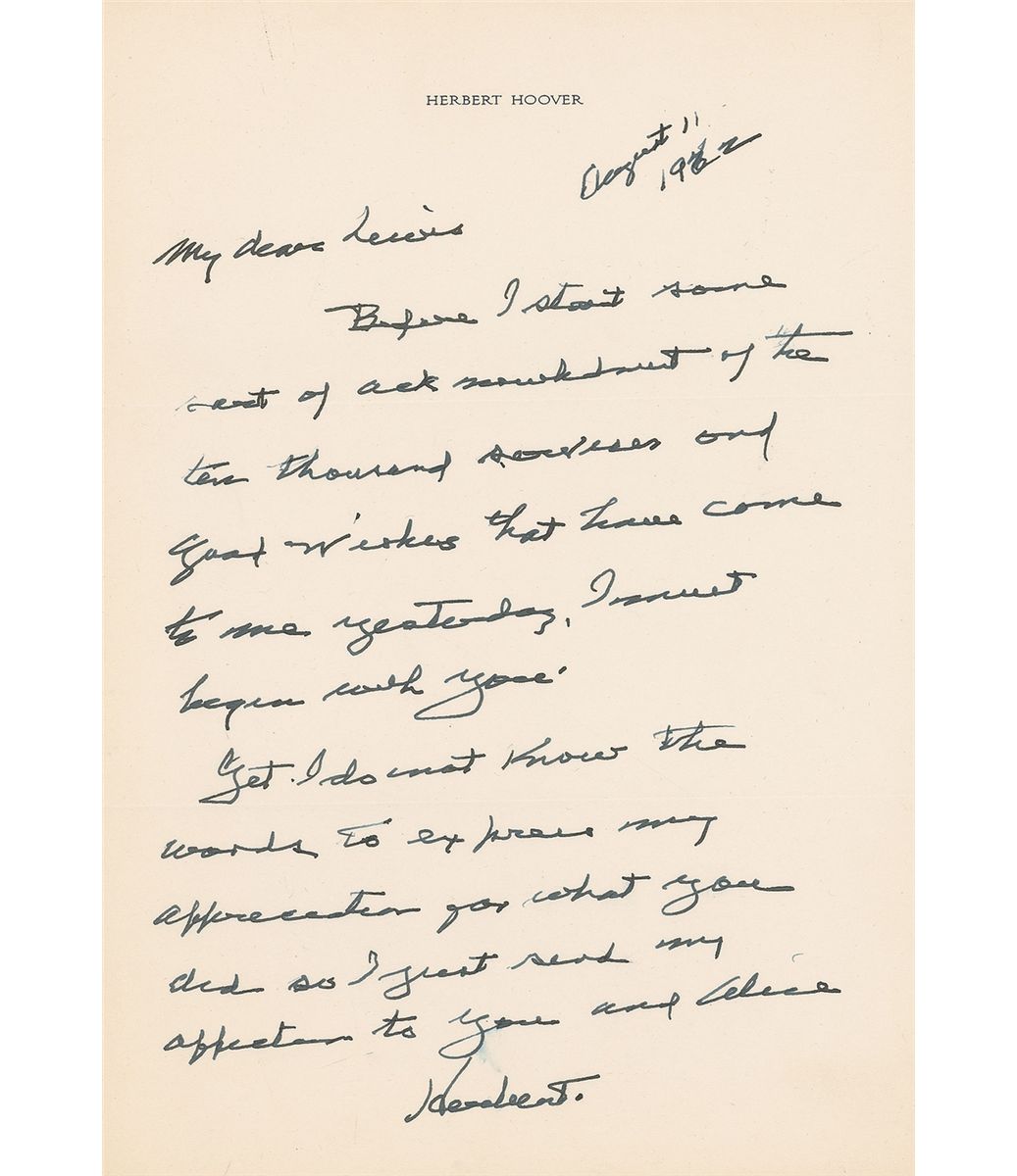 Rare ALS signed “Herbert,” one page, 7.25 x 10.5, personal letterhead, August 11, 1962. In part: “I do not know the words to express my appreciation for what you did so I just send my affection to you and Alice.” In fine condition, with a trivial brush to ink in the last line.
