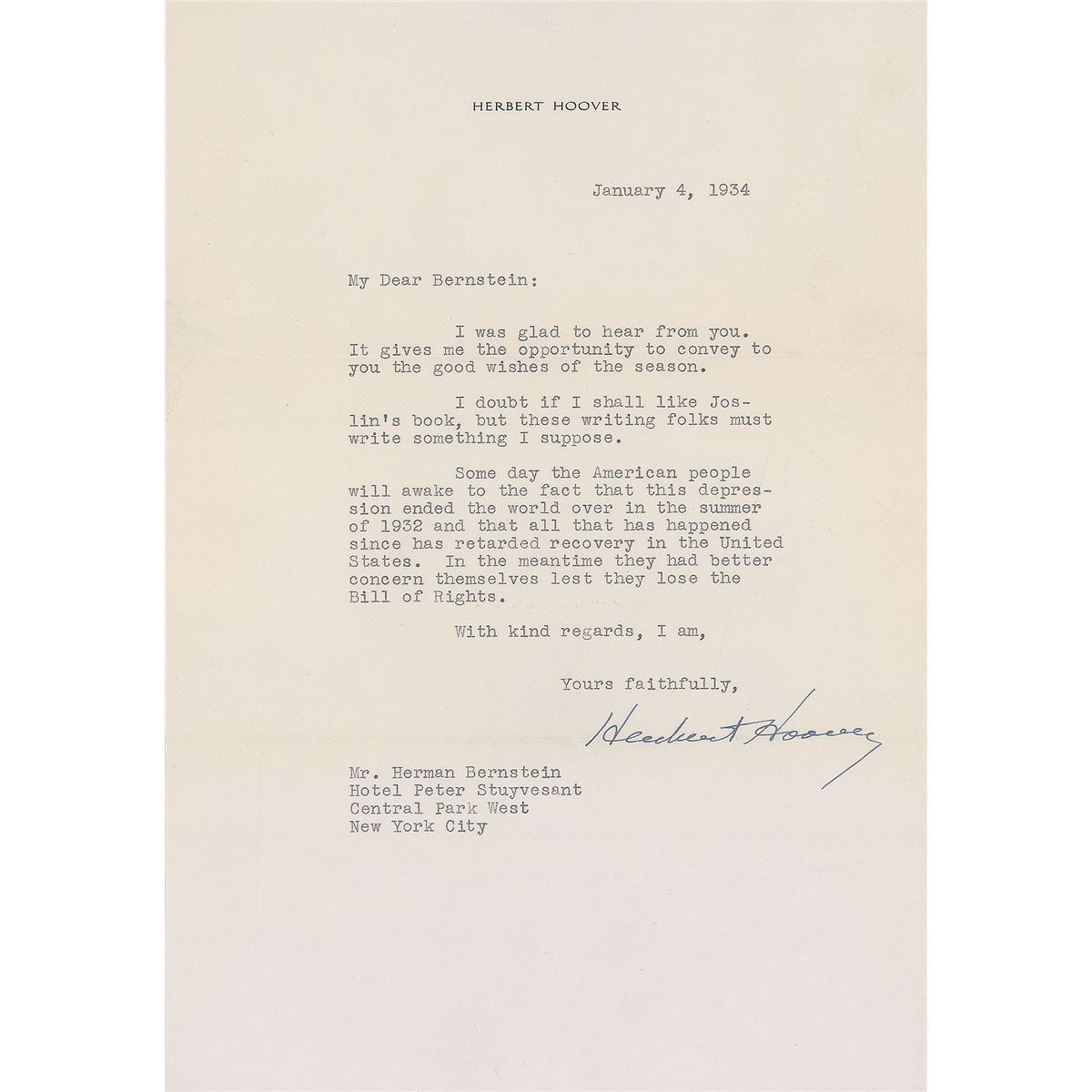 TLS, one page, 7.25 x 10.5, personal letterhead, January 4, 1934. Letter to Herman Bernstein of the Hotel Peter Stuyvesant. In part: “I doubt if I shall like Joslin’s book, but these writing folks must write something I suppose. Some day the American people will awake to the fact that this depression ended the world over in the summer of 1932 and that all that has happened since has retarded recovery in the United States. In the meantime they had better concern themselves lest they lose the Bill of Rights.” In fine condition.