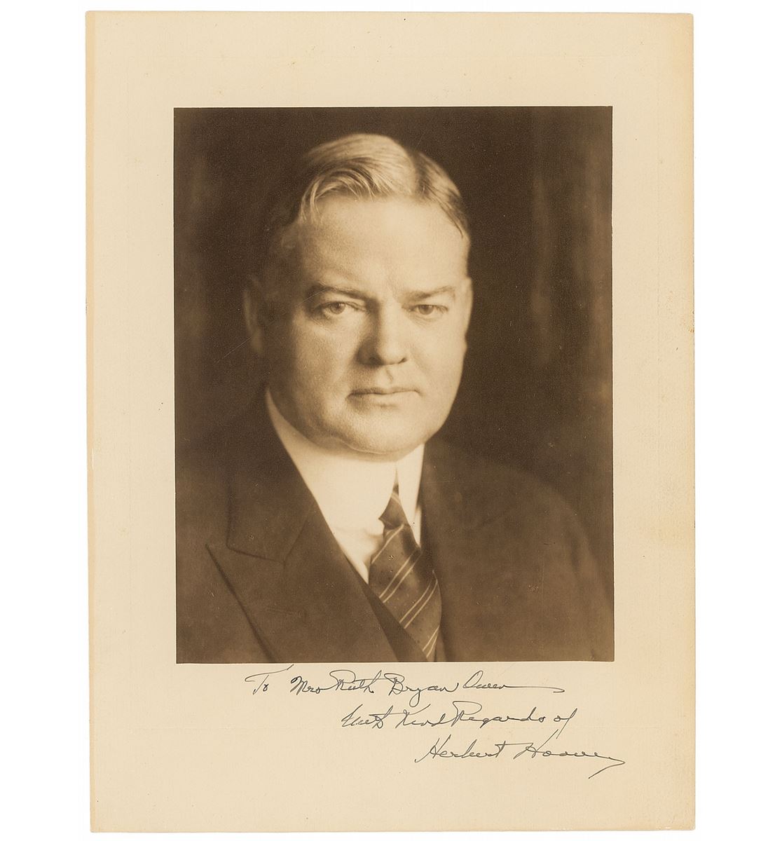 Attractive matte-finish 10 x 13.5 head-and-shoulders portrait, signed and inscribed in fountain pen, “To Mrs. Ruth Bryan Owen, Most Kind Regards of Herbert Hoover.” In fine condition, with light creases to two corners.