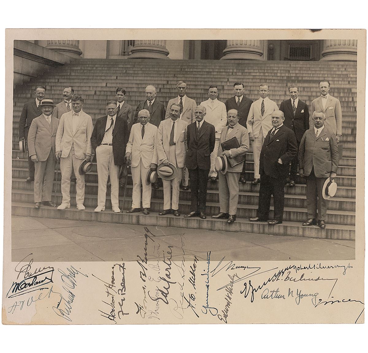 Fantastic matte-finish 9.75 x 8 photo of the members of the World War Foreign Debt Commission and the Belgian Commission, signed in the lower border in fountain pen by each member, including Herbert Hoover, Andrew W. Mellon, Frank B. Kellogg, Reed Smooth, Theodore E. Burton, Charles R. Crisp, Richard Olney, Edward N. Hurley, Garrard B. Winston, Arthur N. Young, and F. G. Blair of the Debt Commission, and Emile de Cartier, Emile Francqui, Felicien Cattier, Georges Theunis, Robert Silvercruys, and Andrew Terlinden of the Belgian Commission. A bit of dampstaining to the lower left affecting two signatures, a paperclip impression and dark mark to the upper border, and a bit of silvering to dark areas of the image, otherwise fine condition. The American group was led by Secretary of the Treasury Andrew Mellon and established in 1922 to negotiate repayment agreements with foreign countries indebted to the United States in the aftermath of World War I, and in 1925 they came to a satisfactory agreement with the Belgian delegation.